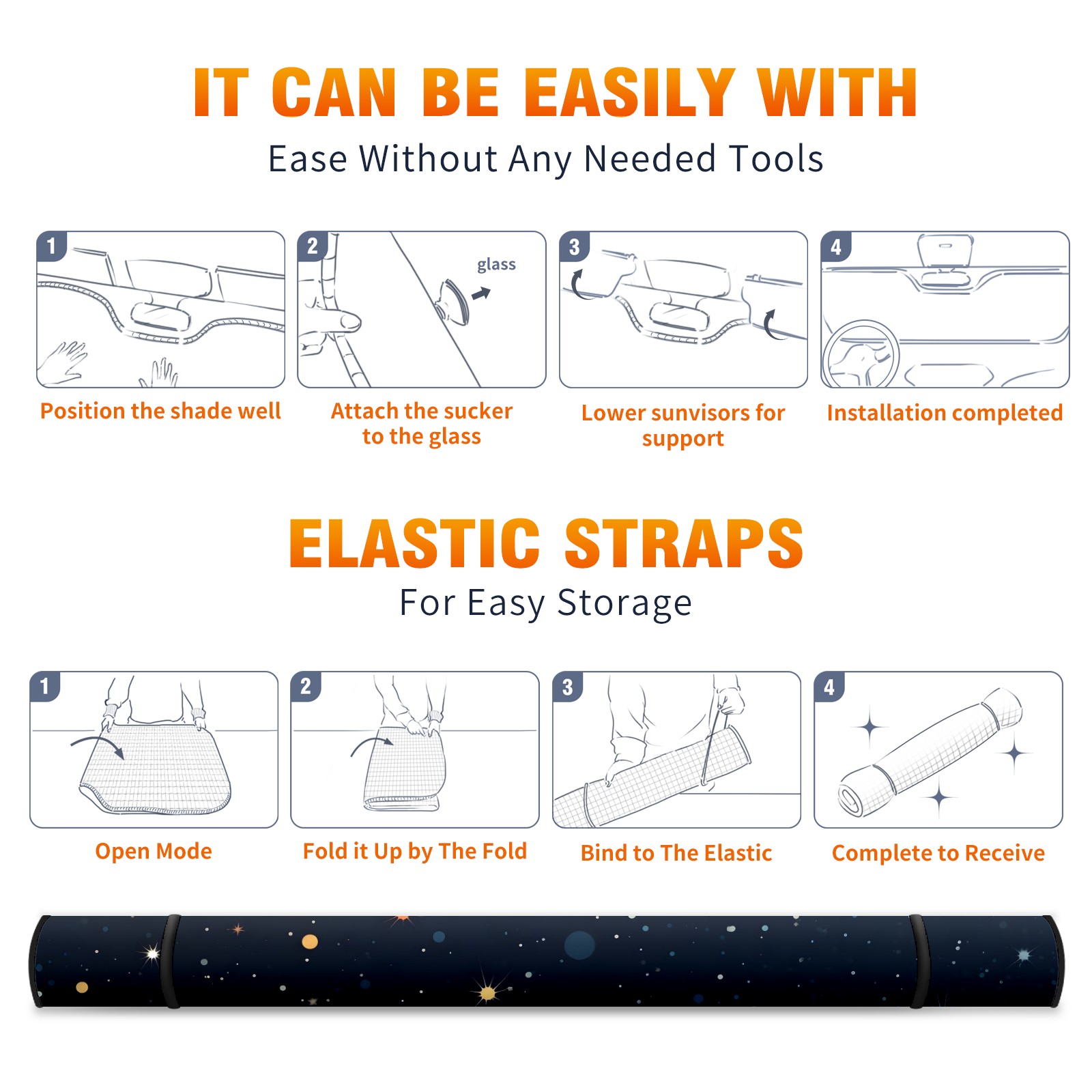 • </b>ZXIVGOQFR Foldable Premium Car Windshield Sunshade is your great solution to reduce your car’s interior temperature dramatically! This is definitely a must-have item for your summer travel! </b> <br> </b>Size: 63"L x 33.5"W </b> <br> </b>Blocking Uv Rays & Heat Insulation</b><br> Our vehicle sunshade provides effective UV, sun, and summer heat protection .Maintains dashboards by preventing fading and cracking <br> </b>Easy-To-Store Folding Design Makes Storage Convenient </b><br> ZXIVGOQFR car sunshades come with removable suction cups and elastic bands that you can install easily and quickly, and the removable suction cups will not leave any marks on your windows when removed. Within seconds, windshield visor can be installed and removed. When not in use,the front windshield can be easily and effectively placed on the door pocket or the dashboard, which is beautiful and does not take up space in the car.<br> <br> </b>PUT UP A 'PROTECTIVE UMBRELLA' FOR YOUR BELOVED CAR!</b>