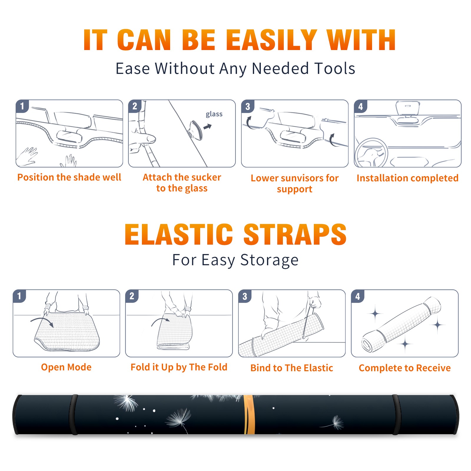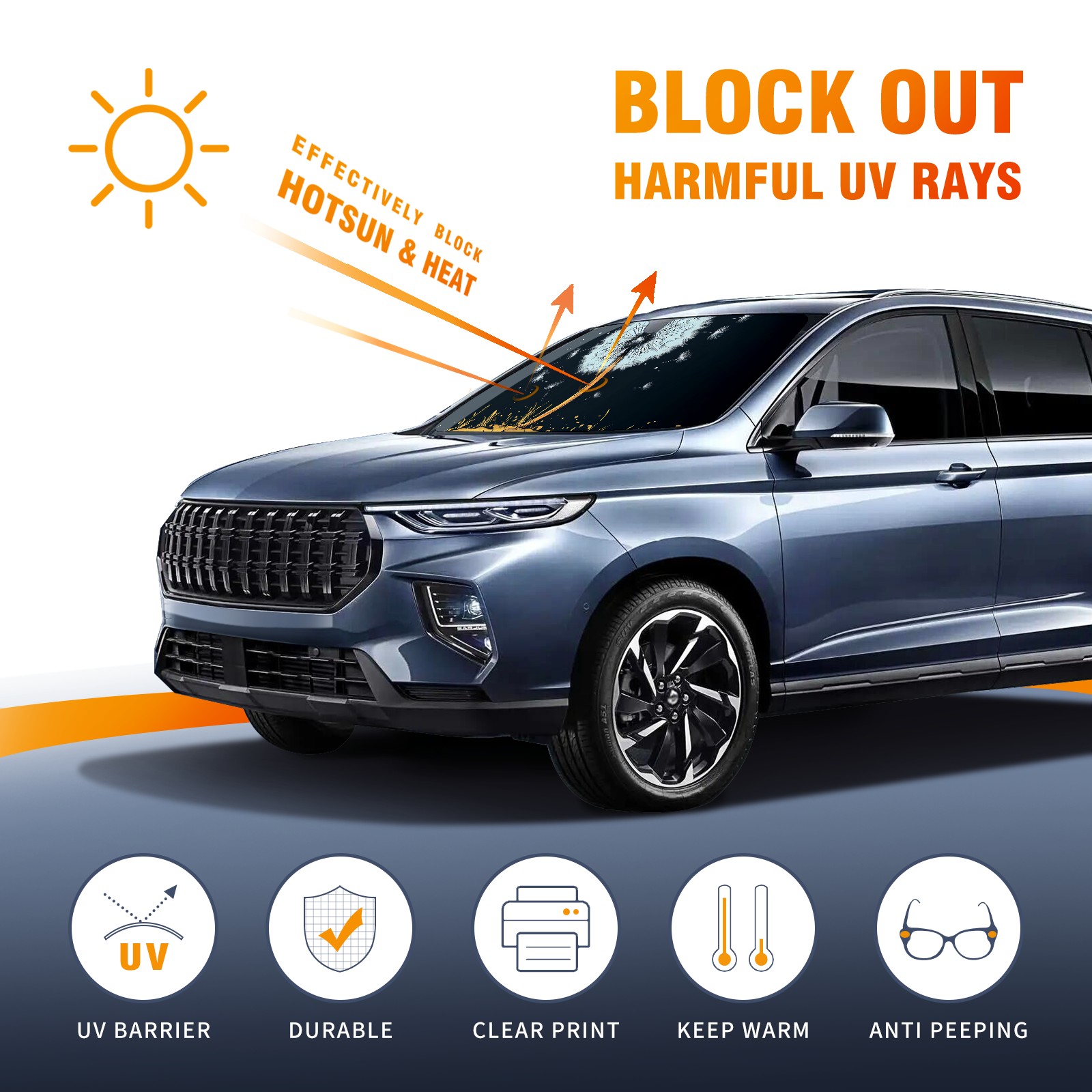 • </b>ZXIVGOQFR Foldable Premium Car Windshield Sunshade is your great solution to reduce your car’s interior temperature dramatically! This is definitely a must-have item for your summer travel! </b> <br> </b>Size: 63"L x 33.5"W </b> <br> </b>Blocking Uv Rays & Heat Insulation</b><br> Our vehicle sunshade provides effective UV, sun, and summer heat protection .Maintains dashboards by preventing fading and cracking <br> </b>Easy-To-Store Folding Design Makes Storage Convenient </b><br> ZXIVGOQFR car sunshades come with removable suction cups and elastic bands that you can install easily and quickly, and the removable suction cups will not leave any marks on your windows when removed. Within seconds, windshield visor can be installed and removed. When not in use,the front windshield can be easily and effectively placed on the door pocket or the dashboard, which is beautiful and does not take up space in the car.<br> <br> </b>PUT UP A 'PROTECTIVE UMBRELLA' FOR YOUR BELOVED CAR!</b>