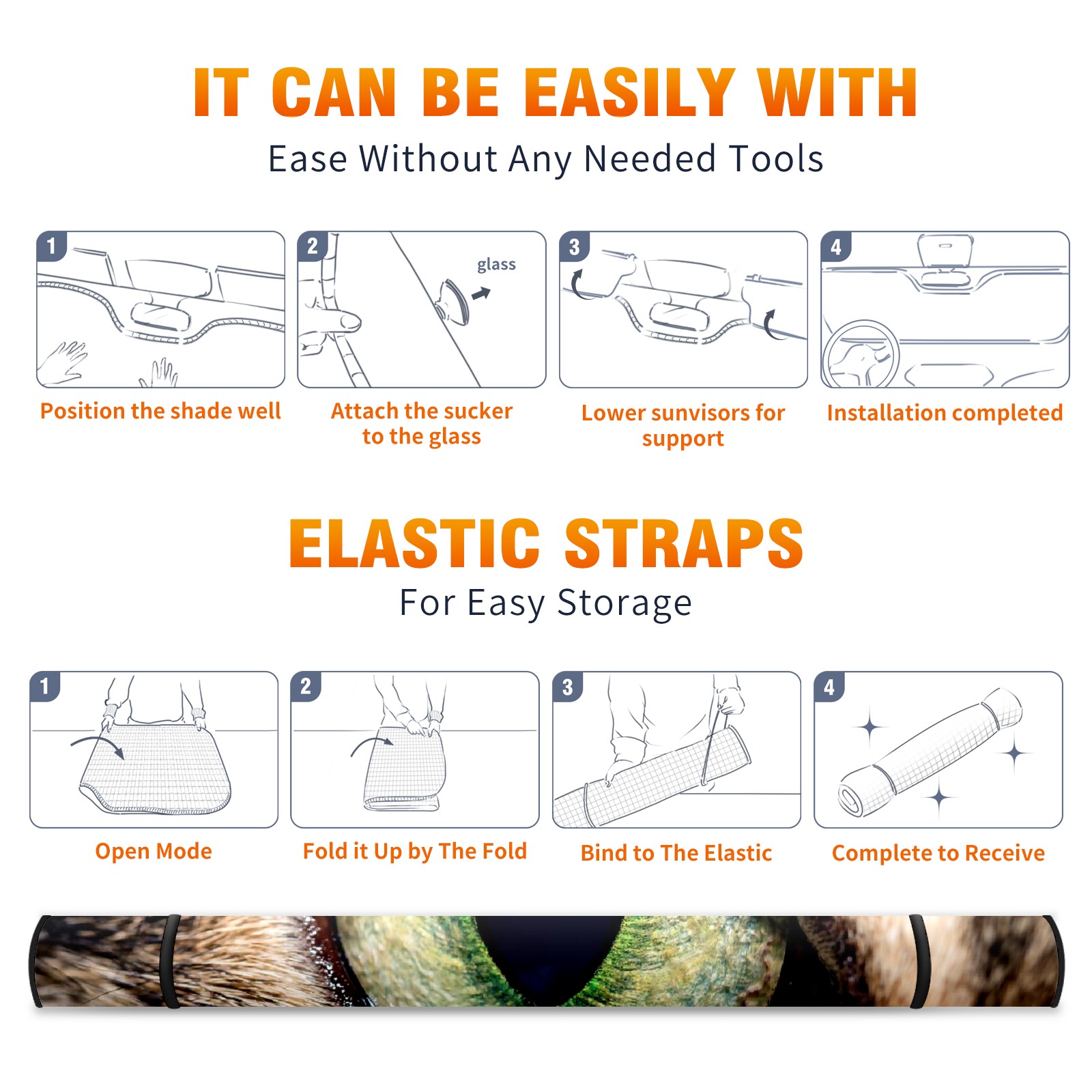 • </b>ZXIVGOQFR Foldable Premium Car Windshield Sunshade is your great solution to reduce your car’s interior temperature dramatically! This is definitely a must-have item for your summer travel! </b> <br> </b>Size: 63"L x 33.5"W </b> <br> </b>Blocking Uv Rays & Heat Insulation</b><br> Our vehicle sunshade provides effective UV, sun, and summer heat protection .Maintains dashboards by preventing fading and cracking <br> </b>Easy-To-Store Folding Design Makes Storage Convenient </b><br> ZXIVGOQFR car sunshades come with removable suction cups and elastic bands that you can install easily and quickly, and the removable suction cups will not leave any marks on your windows when removed. Within seconds, windshield visor can be installed and removed. When not in use,the front windshield can be easily and effectively placed on the door pocket or the dashboard, which is beautiful and does not take up space in the car.<br> <br> </b>PUT UP A 'PROTECTIVE UMBRELLA' FOR YOUR BELOVED CAR!</b>