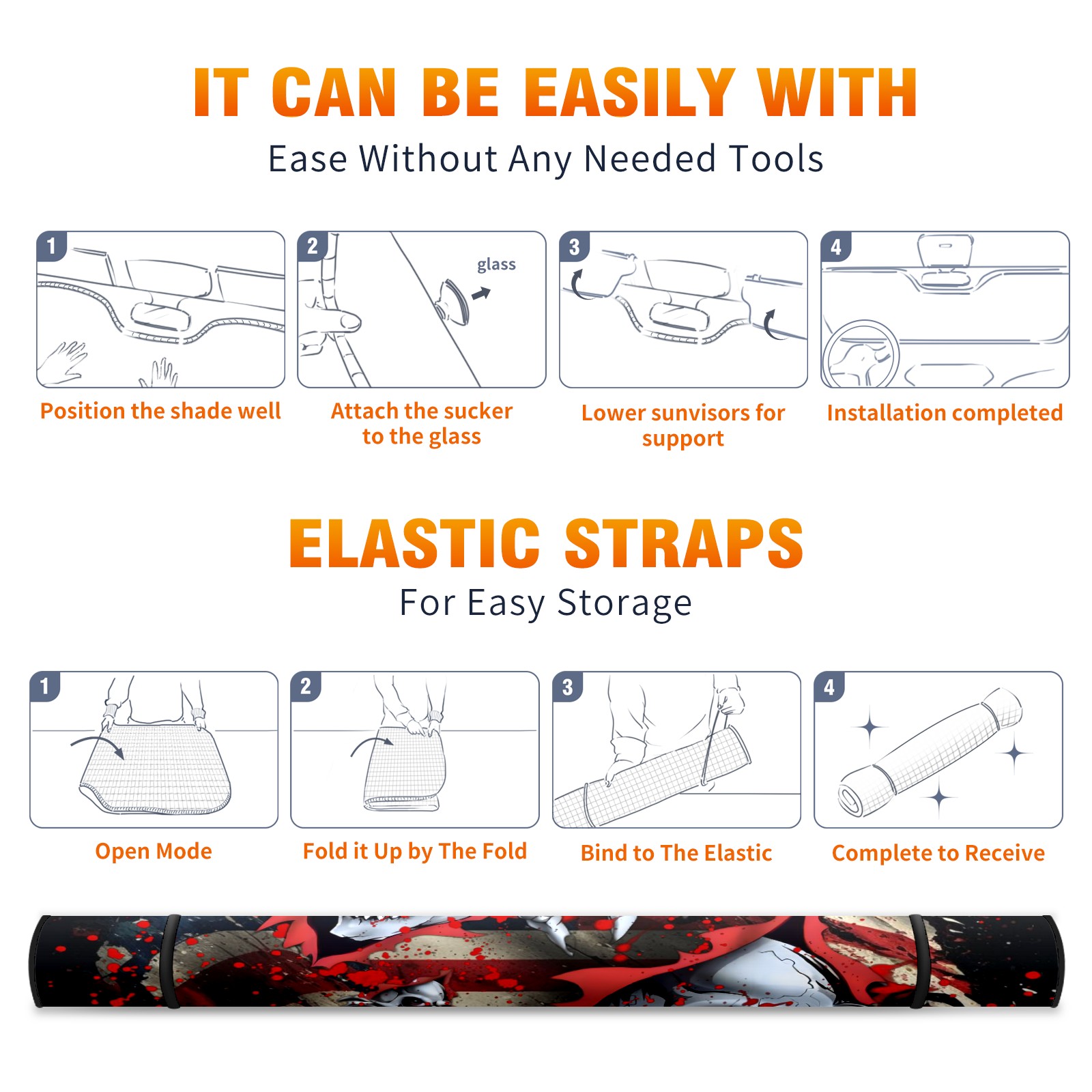 • </b>ZXIVGOQFR Foldable Premium Car Windshield Sunshade is your great solution to reduce your car’s interior temperature dramatically! This is definitely a must-have item for your summer travel! </b> <br> </b>Size: 63"L x 33.5"W </b> <br> </b>Blocking Uv Rays & Heat Insulation</b><br> Our vehicle sunshade provides effective UV, sun, and summer heat protection .Maintains dashboards by preventing fading and cracking <br> </b>Easy-To-Store Folding Design Makes Storage Convenient </b><br> ZXIVGOQFR car sunshades come with removable suction cups and elastic bands that you can install easily and quickly, and the removable suction cups will not leave any marks on your windows when removed. Within seconds, windshield visor can be installed and removed. When not in use,the front windshield can be easily and effectively placed on the door pocket or the dashboard, which is beautiful and does not take up space in the car.<br> <br> </b>PUT UP A 'PROTECTIVE UMBRELLA' FOR YOUR BELOVED CAR!</b>