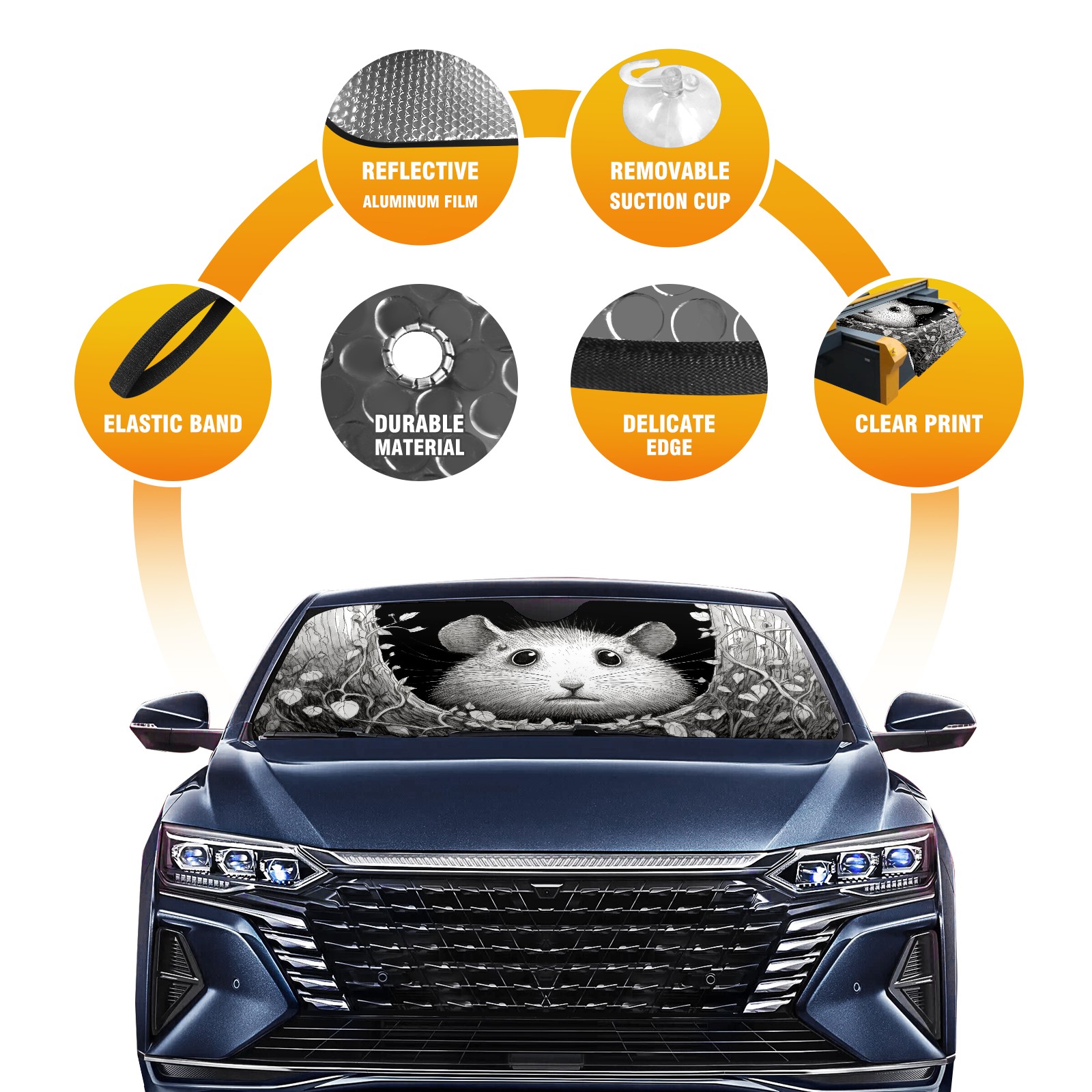 </b>ZXIVGOQFR Foldable Premium Car Windshield Sunshade is your great solution to reduce your car’s interior temperature dramatically! This is definitely a must-have item for your summer travel! </b> <br> ●</b>Size: 63"L x 33.5"W </b> <br> ●</b>Blocking Uv Rays & Heat Insulation</b><br> Our vehicle sunshade provides effective UV, sun, and summer heat protection .Maintains dashboards by preventing fading and cracking <br> ●</b>Easy-To-Store Folding Design Makes Storage Convenient </b><br> ZXIVGOQFR car sunshades come with removable suction cups and elastic bands that you can install easily and quickly, and the removable suction cups will not leave any marks on your windows when removed. Within seconds, windshield visor can be installed and removed. When not in use,the front windshield can be easily and effectively placed on the door pocket or the dashboard, which is beautiful and does not take up space in the car.<br> <br> </b>PUT UP A 'PROTECTIVE UMBRELLA' FOR YOUR BELOVED CAR!</b>