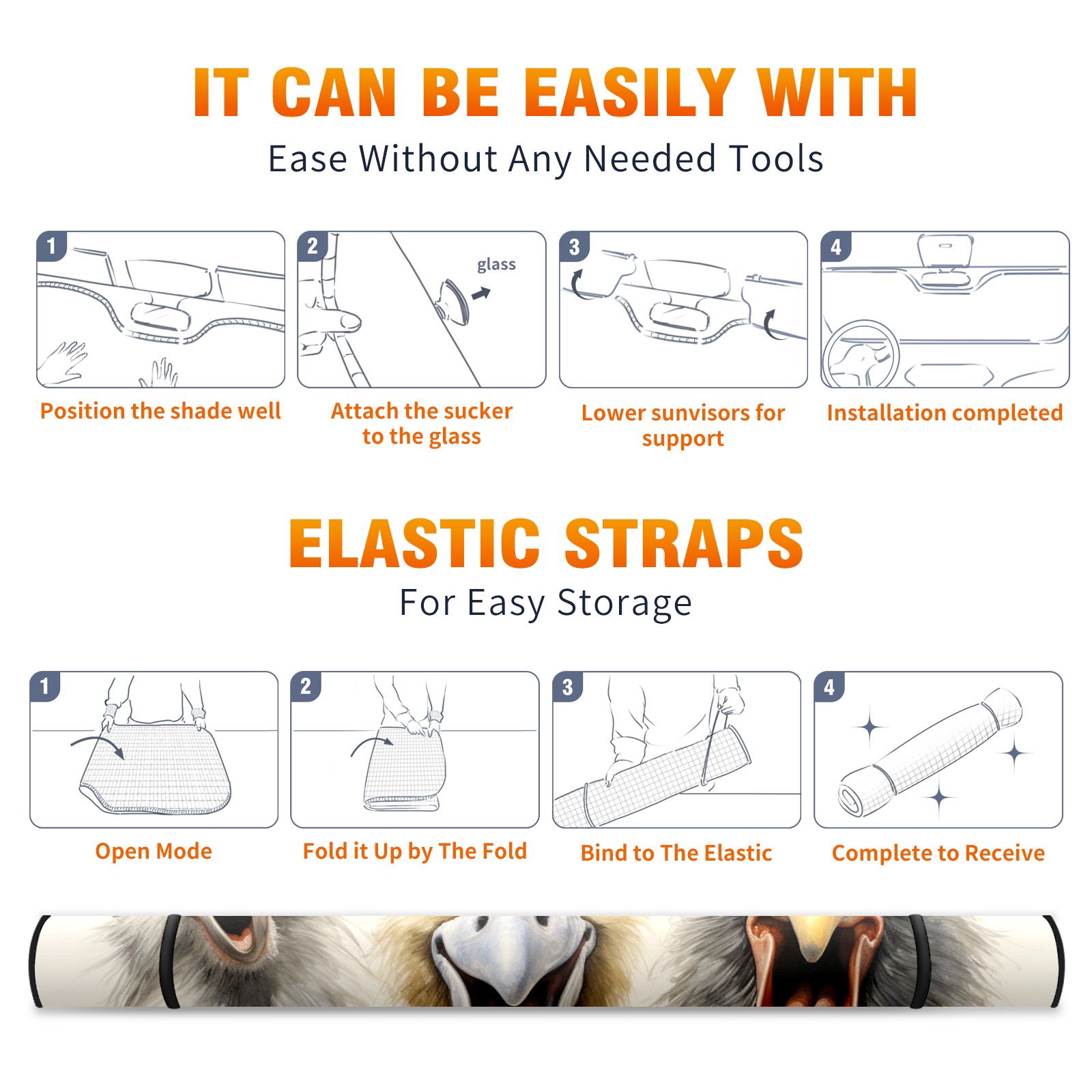 • </b>ZXIVGOQFR Foldable Premium Car Windshield Sunshade is your great solution to reduce your car’s interior temperature dramatically! This is definitely a must-have item for your summer travel! </b> <br> ●</b>Size: 63"L x 33.5"W </b> <br> ●</b>Blocking Uv Rays & Heat Insulation</b><br> Our vehicle sunshade provides effective UV, sun, and summer heat protection .Maintains dashboards by preventing fading and cracking <br> ●</b>Easy-To-Store Folding Design Makes Storage Convenient </b><br> ZXIVGOQFR car sunshades come with removable suction cups and elastic bands that you can install easily and quickly, and the removable suction cups will not leave any marks on your windows when removed. Within seconds, windshield visor can be installed and removed. When not in use,the front windshield can be easily and effectively placed on the door pocket or the dashboard, which is beautiful and does not take up space in the car.<br> <br> </b>PUT UP A 'PROTECTIVE UMBRELLA' FOR YOUR BELOVED CAR!</b>
