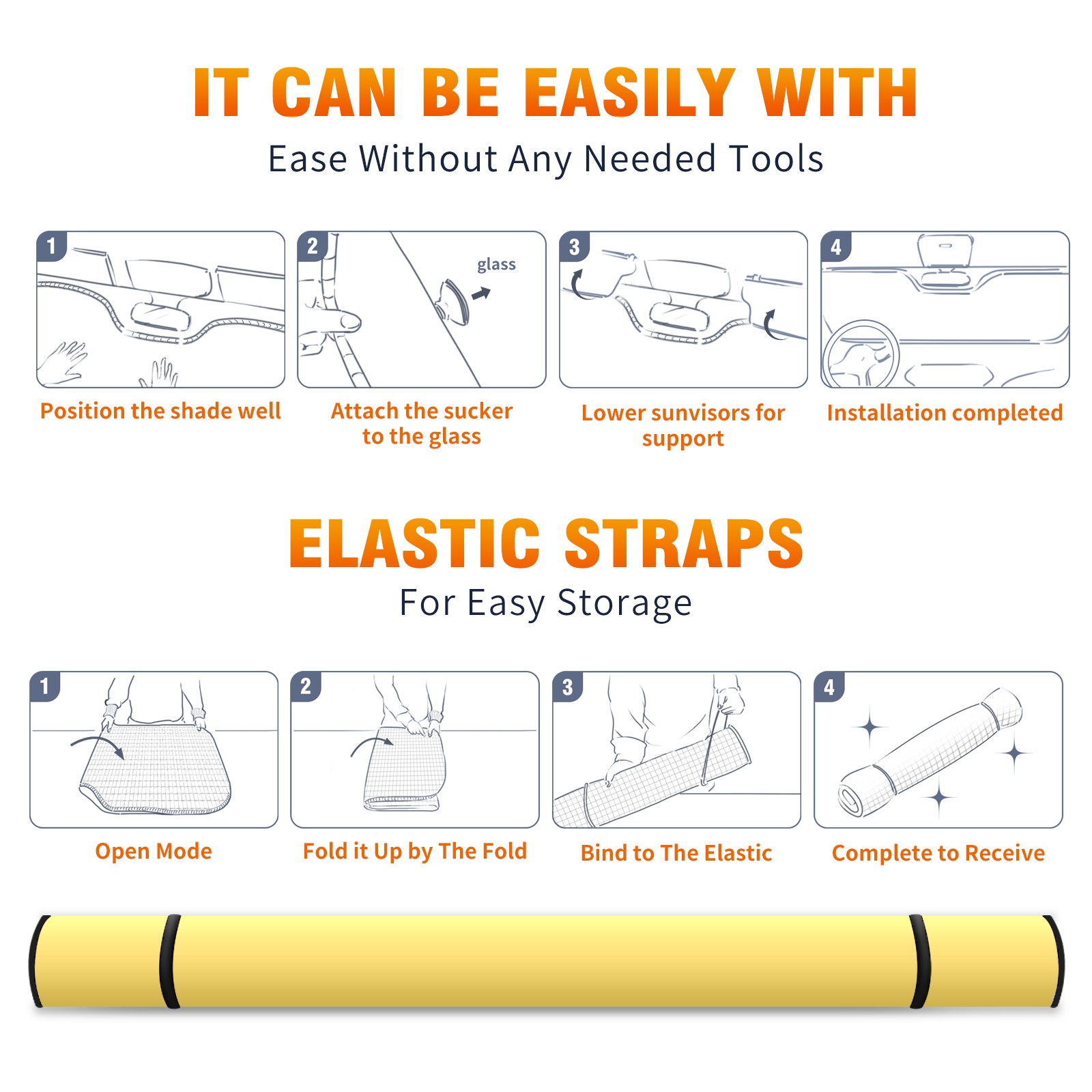 </b>ZXIVGOQFR Foldable Premium Car Windshield Sunshade is your great solution to reduce your car’s interior temperature dramatically! This is definitely a must-have item for your summer travel! </b> <br> ●</b>Size: 63"L x 33.5"W </b> <br> ●</b>Blocking Uv Rays & Heat Insulation</b><br> Our vehicle sunshade provides effective UV, sun, and summer heat protection .Maintains dashboards by preventing fading and cracking <br> ●</b>Easy-To-Store Folding Design Makes Storage Convenient </b><br> ZXIVGOQFR car sunshades come with removable suction cups and elastic bands that you can install easily and quickly, and the removable suction cups will not leave any marks on your windows when removed. Within seconds, windshield visor can be installed and removed. When not in use,the front windshield can be easily and effectively placed on the door pocket or the dashboard, which is beautiful and does not take up space in the car.<br> <br> </b>PUT UP A 'PROTECTIVE UMBRELLA' FOR YOUR BELOVED CAR!</b>