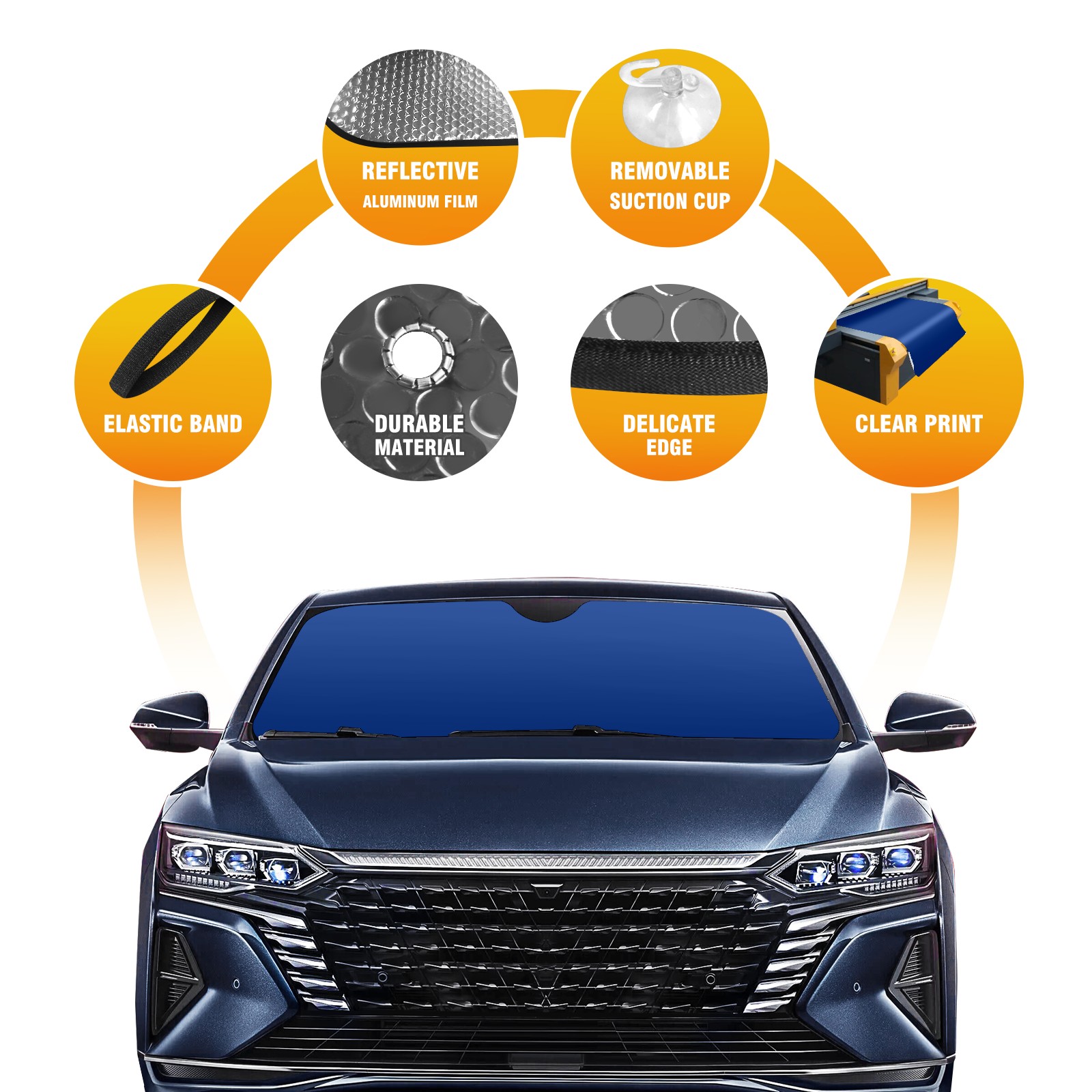 </b>ZXIVGOQFR Foldable Premium Car Windshield Sunshade is your great solution to reduce your car’s interior temperature dramatically! This is definitely a must-have item for your summer travel! </b> <br> ●</b>Size: 63"L x 33.5"W </b> <br> ●</b>Blocking Uv Rays & Heat Insulation</b><br> Our vehicle sunshade provides effective UV, sun, and summer heat protection .Maintains dashboards by preventing fading and cracking <br> ●</b>Easy-To-Store Folding Design Makes Storage Convenient </b><br> ZXIVGOQFR car sunshades come with removable suction cups and elastic bands that you can install easily and quickly, and the removable suction cups will not leave any marks on your windows when removed. Within seconds, windshield visor can be installed and removed. When not in use,the front windshield can be easily and effectively placed on the door pocket or the dashboard, which is beautiful and does not take up space in the car.<br> <br> </b>PUT UP A 'PROTECTIVE UMBRELLA' FOR YOUR BELOVED CAR!</b>