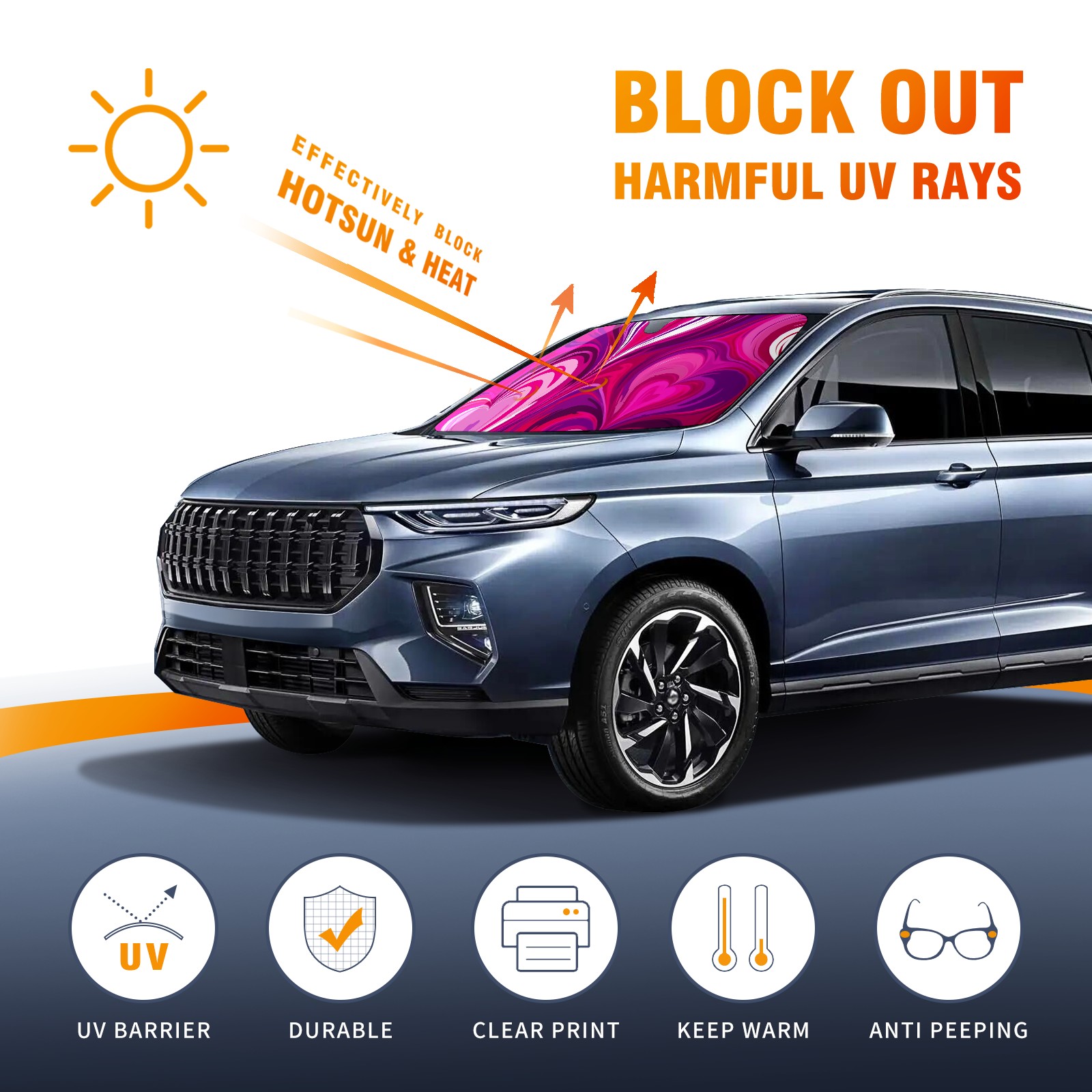 </b>ZXIVGOQFR Foldable Premium Car Windshield Sunshade is your great solution to reduce your car’s interior temperature dramatically! This is definitely a must-have item for your summer travel! </b> <br> ●</b>Size: 63"L x 33.5"W </b> <br> ●</b>Blocking Uv Rays & Heat Insulation</b><br> Our vehicle sunshade provides effective UV, sun, and summer heat protection .Maintains dashboards by preventing fading and cracking <br> ●</b>Easy-To-Store Folding Design Makes Storage Convenient </b><br> ZXIVGOQFR car sunshades come with removable suction cups and elastic bands that you can install easily and quickly, and the removable suction cups will not leave any marks on your windows when removed. Within seconds, windshield visor can be installed and removed. When not in use,the front windshield can be easily and effectively placed on the door pocket or the dashboard, which is beautiful and does not take up space in the car.<br> <br> </b>PUT UP A 'PROTECTIVE UMBRELLA' FOR YOUR BELOVED CAR!</b>