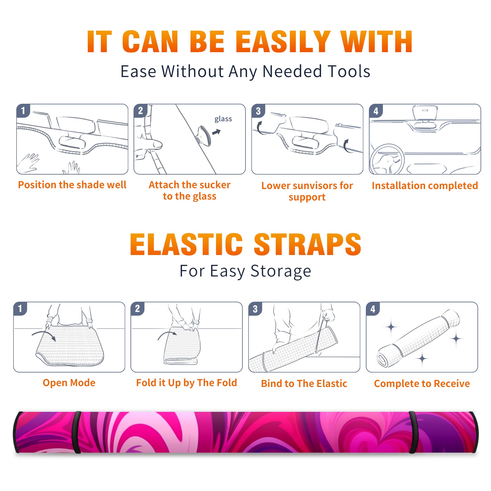 • </b>ZXIVGOQFR Foldable Premium Car Windshield Sunshade is your great solution to reduce your car’s interior temperature dramatically! This is definitely a must-have item for your summer travel! </b> <br> ●</b>Size: 63"L x 33.5"W </b> <br> ●</b>Blocking Uv Rays & Heat Insulation</b><br> Our vehicle sunshade provides effective UV, sun, and summer heat protection .Maintains dashboards by preventing fading and cracking <br> ●</b>Easy-To-Store Folding Design Makes Storage Convenient </b><br> ZXIVGOQFR car sunshades come with removable suction cups and elastic bands that you can install easily and quickly, and the removable suction cups will not leave any marks on your windows when removed. Within seconds, windshield visor can be installed and removed. When not in use,the front windshield can be easily and effectively placed on the door pocket or the dashboard, which is beautiful and does not take up space in the car.<br> <br> </b>PUT UP A 'PROTECTIVE UMBRELLA' FOR YOUR BELOVED CAR!</b>