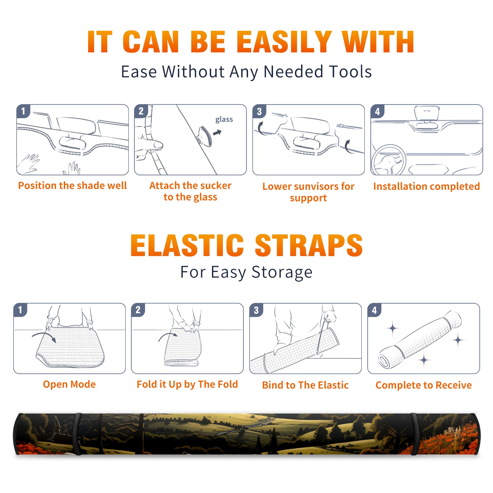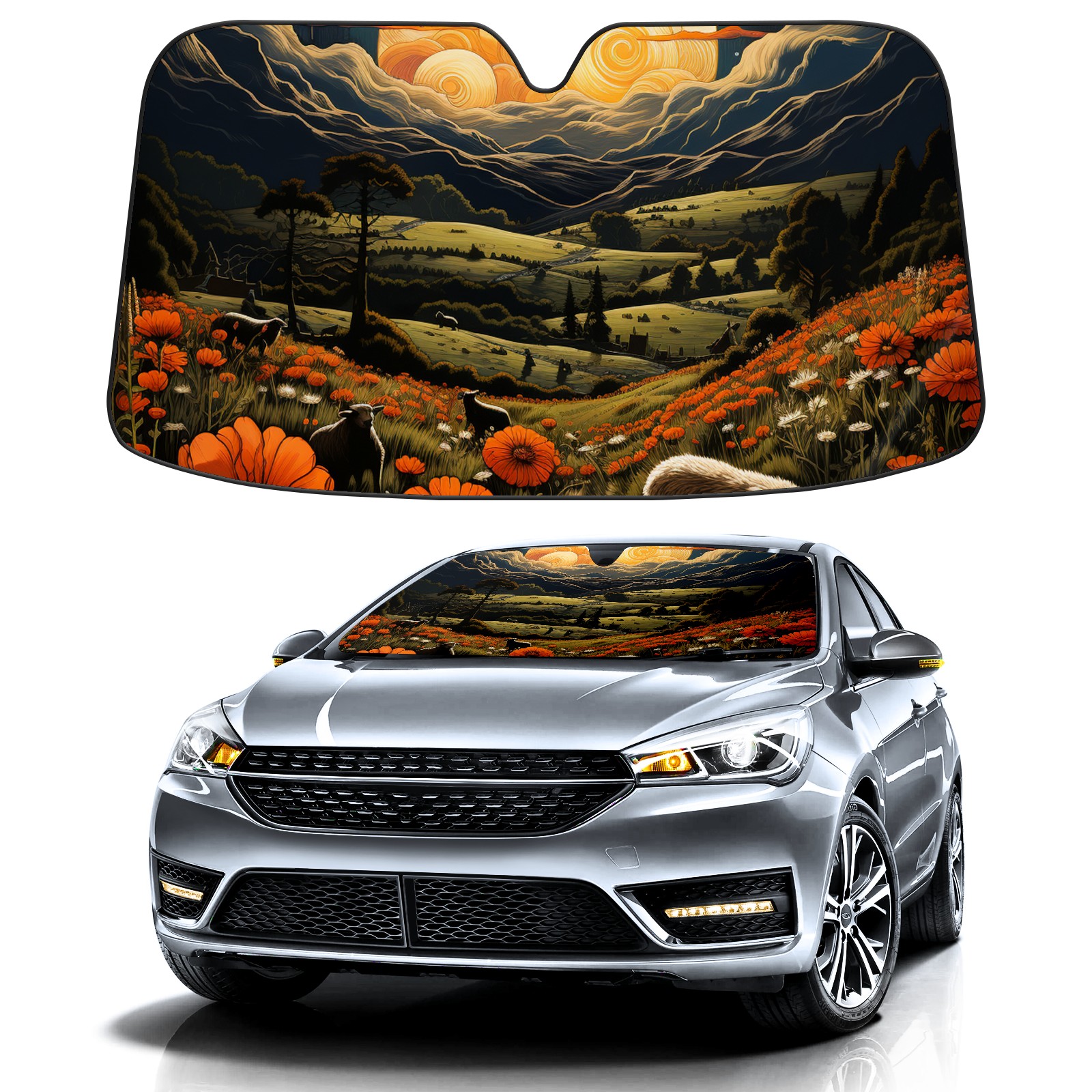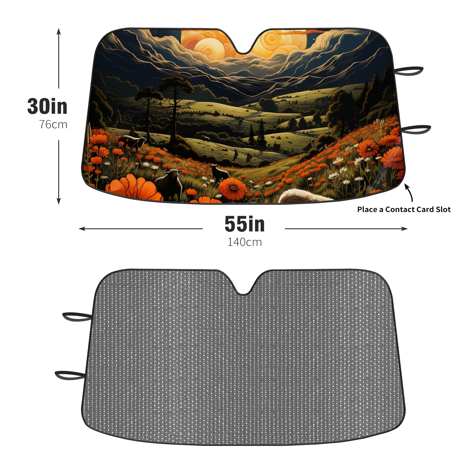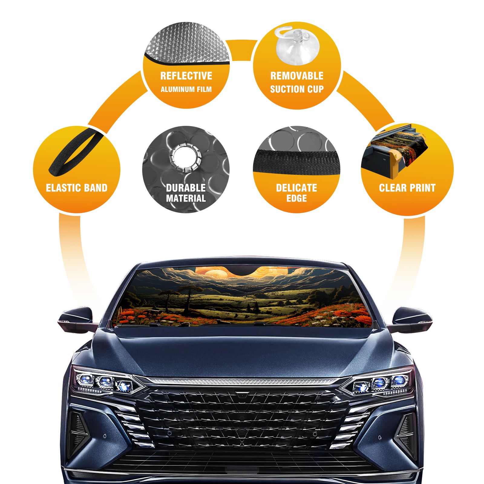 </b>ZXIVGOQFR Foldable Premium Car Windshield Sunshade is your great solution to reduce your car’s interior temperature dramatically! This is definitely a must-have item for your summer travel! </b> <br> ●</b>Size: 63"L x 33.5"W </b> <br> ●</b>Blocking Uv Rays & Heat Insulation</b><br> Our vehicle sunshade provides effective UV, sun, and summer heat protection .Maintains dashboards by preventing fading and cracking <br> ●</b>Easy-To-Store Folding Design Makes Storage Convenient </b><br> ZXIVGOQFR car sunshades come with removable suction cups and elastic bands that you can install easily and quickly, and the removable suction cups will not leave any marks on your windows when removed. Within seconds, windshield visor can be installed and removed. When not in use,the front windshield can be easily and effectively placed on the door pocket or the dashboard, which is beautiful and does not take up space in the car.<br> <br> </b>PUT UP A 'PROTECTIVE UMBRELLA' FOR YOUR BELOVED CAR!</b>