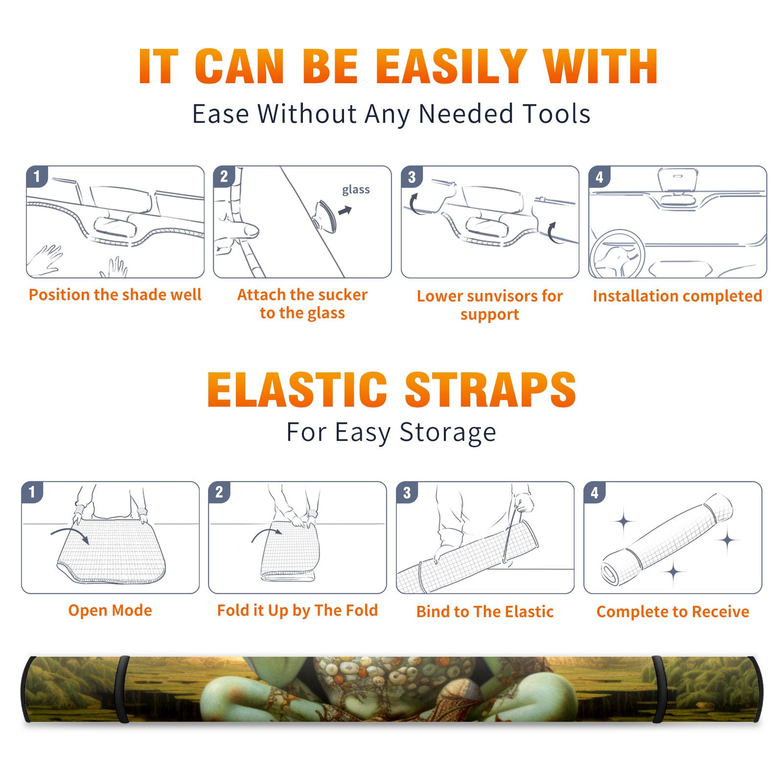 • </b>ZXIVGOQFR Foldable Premium Car Windshield Sunshade is your great solution to reduce your car’s interior temperature dramatically! This is definitely a must-have item for your summer travel! </b> <br> ●</b>Size: 63"L x 33.5"W </b> <br> ●</b>Blocking Uv Rays & Heat Insulation</b><br> Our vehicle sunshade provides effective UV, sun, and summer heat protection .Maintains dashboards by preventing fading and cracking <br> ●</b>Easy-To-Store Folding Design Makes Storage Convenient </b><br> ZXIVGOQFR car sunshades come with removable suction cups and elastic bands that you can install easily and quickly, and the removable suction cups will not leave any marks on your windows when removed. Within seconds, windshield visor can be installed and removed. When not in use,the front windshield can be easily and effectively placed on the door pocket or the dashboard, which is beautiful and does not take up space in the car.<br> <br> </b>PUT UP A 'PROTECTIVE UMBRELLA' FOR YOUR BELOVED CAR!</b>