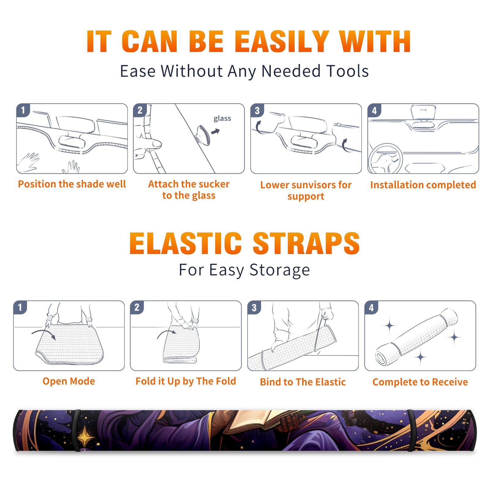 </b>ZXIVGOQFR Foldable Premium Car Windshield Sunshade is your great solution to reduce your car’s interior temperature dramatically! This is definitely a must-have item for your summer travel! </b> <br> ●</b>Size: 63"L x 33.5"W </b> <br> ●</b>Blocking Uv Rays & Heat Insulation</b><br> Our vehicle sunshade provides effective UV, sun, and summer heat protection .Maintains dashboards by preventing fading and cracking <br> ●</b>Easy-To-Store Folding Design Makes Storage Convenient </b><br> ZXIVGOQFR car sunshades come with removable suction cups and elastic bands that you can install easily and quickly, and the removable suction cups will not leave any marks on your windows when removed. Within seconds, windshield visor can be installed and removed. When not in use,the front windshield can be easily and effectively placed on the door pocket or the dashboard, which is beautiful and does not take up space in the car.<br> <br> </b>PUT UP A 'PROTECTIVE UMBRELLA' FOR YOUR BELOVED CAR!</b>