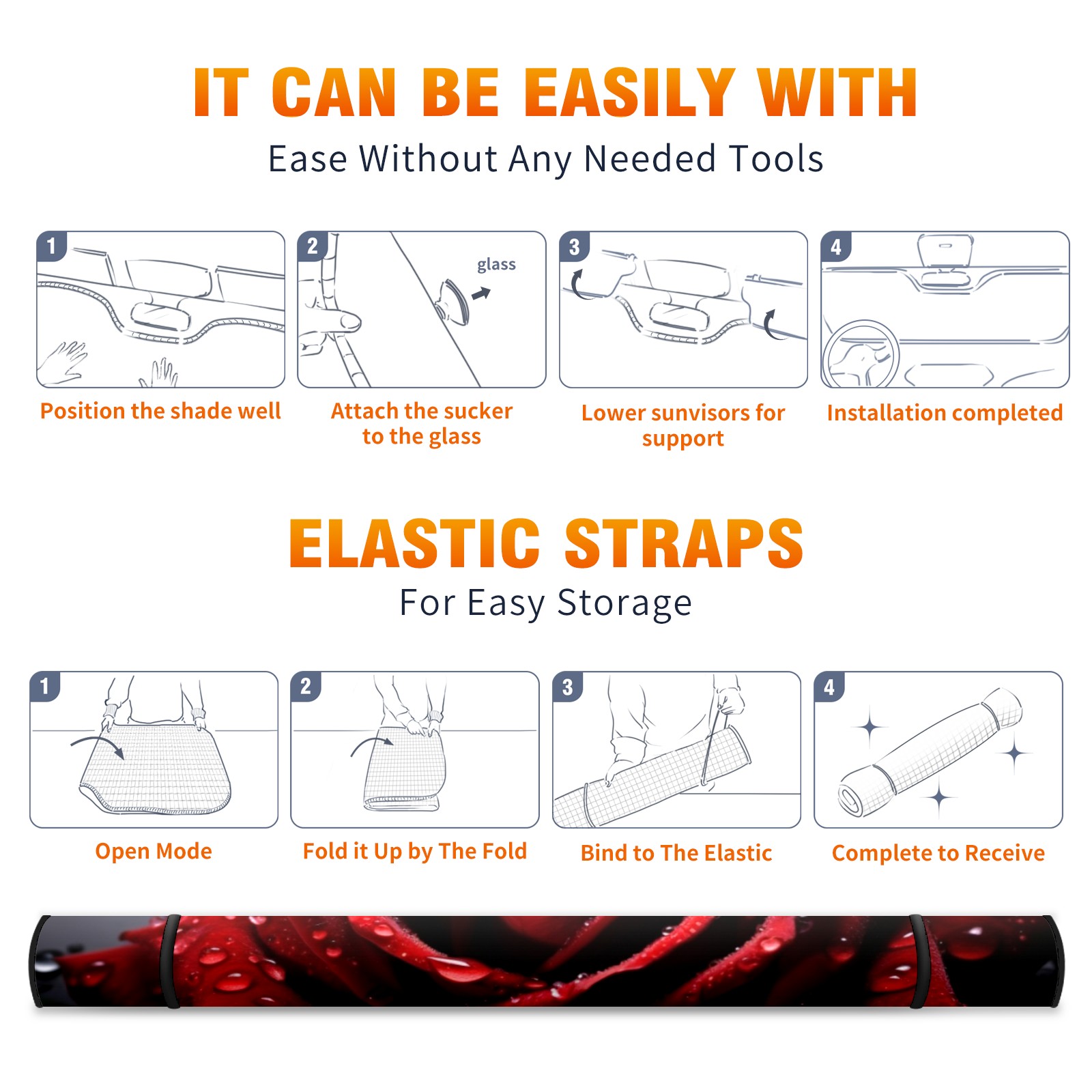 </b>ZXIVGOQFR Foldable Premium Car Windshield Sunshade is your great solution to reduce your car’s interior temperature dramatically! This is definitely a must-have item for your summer travel! </b> <br> ●</b>Size: 63"L x 33.5"W </b> <br> ●</b>Blocking Uv Rays & Heat Insulation</b><br> Our vehicle sunshade provides effective UV, sun, and summer heat protection .Maintains dashboards by preventing fading and cracking <br> ●</b>Easy-To-Store Folding Design Makes Storage Convenient </b><br> ZXIVGOQFR car sunshades come with removable suction cups and elastic bands that you can install easily and quickly, and the removable suction cups will not leave any marks on your windows when removed. Within seconds, windshield visor can be installed and removed. When not in use,the front windshield can be easily and effectively placed on the door pocket or the dashboard, which is beautiful and does not take up space in the car.<br> <br> </b>PUT UP A 'PROTECTIVE UMBRELLA' FOR YOUR BELOVED CAR!</b>