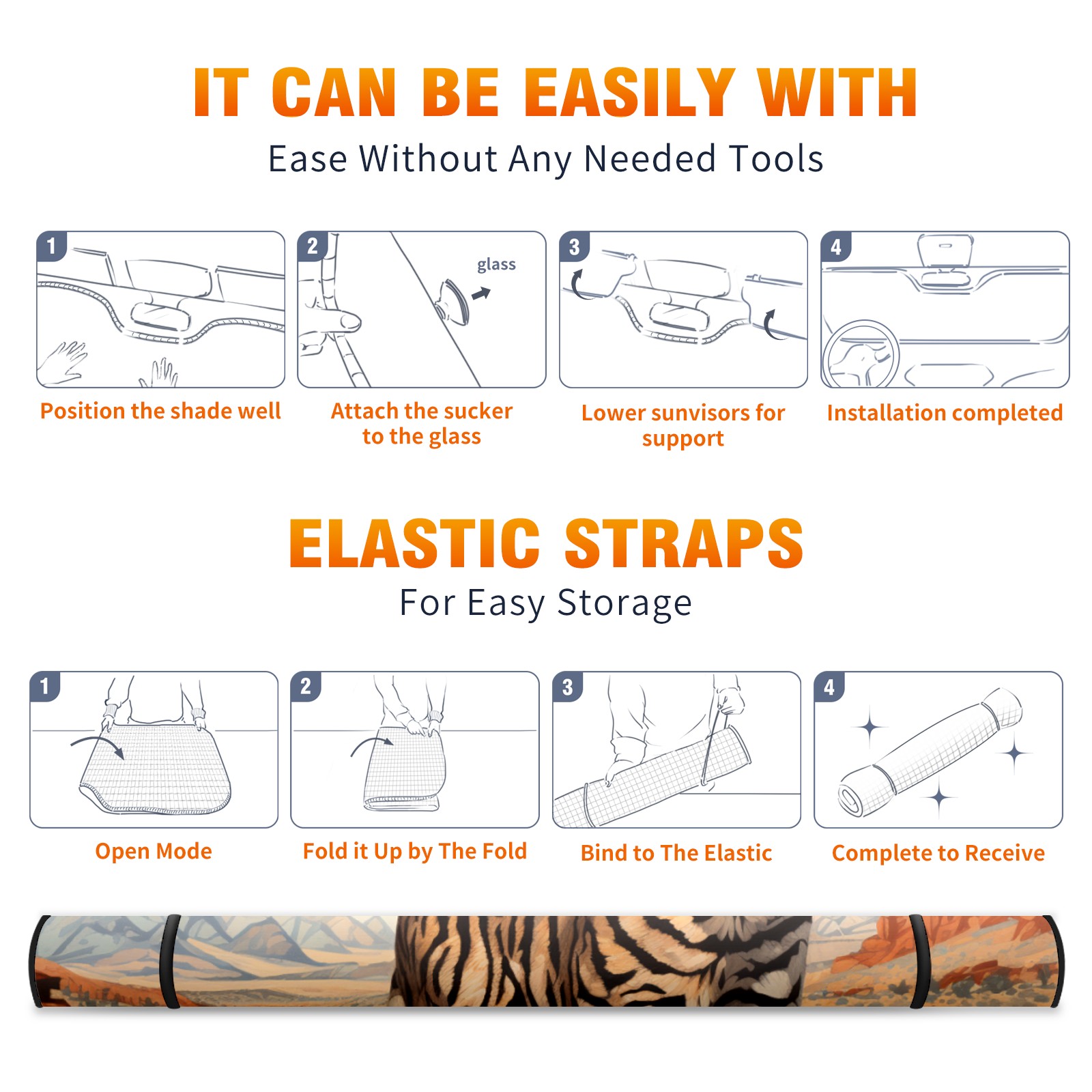 </b>ZXIVGOQFR Foldable Premium Car Windshield Sunshade is your great solution to reduce your car’s interior temperature dramatically! This is definitely a must-have item for your summer travel! </b> <br> ●</b>Size: 63"L x 33.5"W </b> <br> ●</b>Blocking Uv Rays & Heat Insulation</b><br> Our vehicle sunshade provides effective UV, sun, and summer heat protection .Maintains dashboards by preventing fading and cracking <br> ●</b>Easy-To-Store Folding Design Makes Storage Convenient </b><br> ZXIVGOQFR car sunshades come with removable suction cups and elastic bands that you can install easily and quickly, and the removable suction cups will not leave any marks on your windows when removed. Within seconds, windshield visor can be installed and removed. When not in use,the front windshield can be easily and effectively placed on the door pocket or the dashboard, which is beautiful and does not take up space in the car.<br> <br> </b>PUT UP A 'PROTECTIVE UMBRELLA' FOR YOUR BELOVED CAR!</b>
