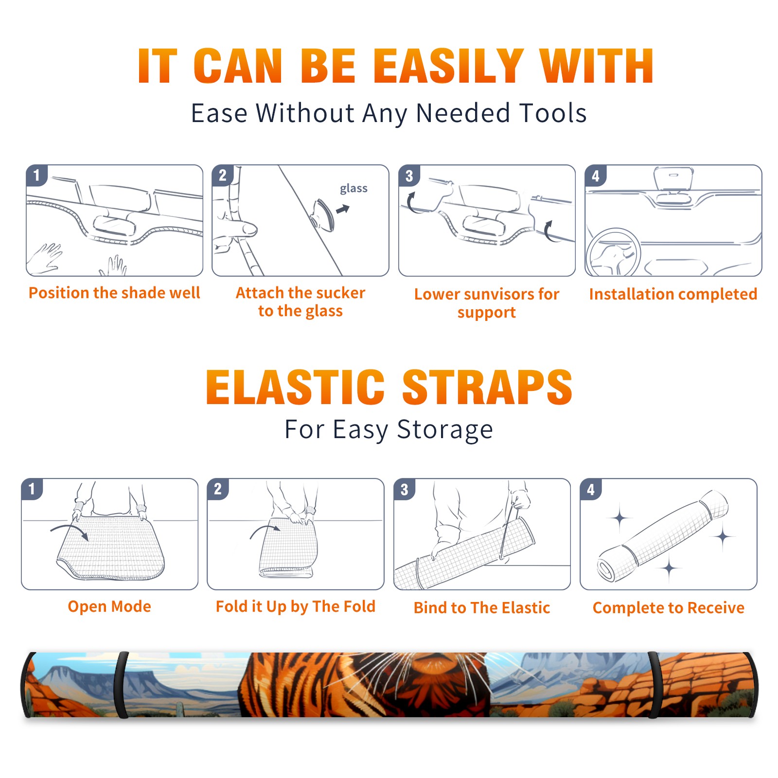 </b>ZXIVGOQFR Foldable Premium Car Windshield Sunshade is your great solution to reduce your car’s interior temperature dramatically! This is definitely a must-have item for your summer travel! </b> <br> ●</b>Size: 63"L x 33.5"W </b> <br> ●</b>Blocking Uv Rays & Heat Insulation</b><br> Our vehicle sunshade provides effective UV, sun, and summer heat protection .Maintains dashboards by preventing fading and cracking <br> ●</b>Easy-To-Store Folding Design Makes Storage Convenient </b><br> ZXIVGOQFR car sunshades come with removable suction cups and elastic bands that you can install easily and quickly, and the removable suction cups will not leave any marks on your windows when removed. Within seconds, windshield visor can be installed and removed. When not in use,the front windshield can be easily and effectively placed on the door pocket or the dashboard, which is beautiful and does not take up space in the car.<br> <br> </b>PUT UP A 'PROTECTIVE UMBRELLA' FOR YOUR BELOVED CAR!</b>