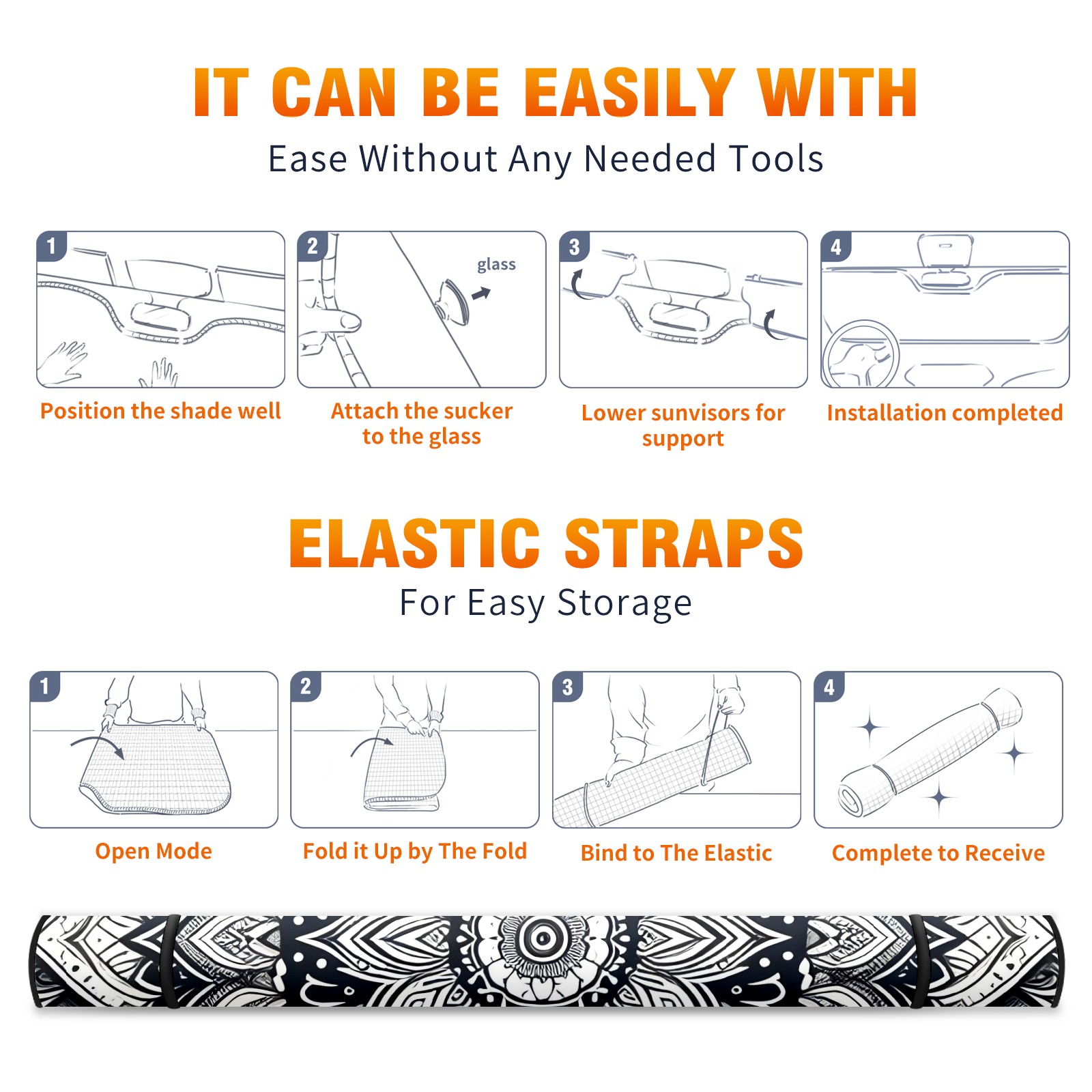 </b>ZXIVGOQFR Foldable Premium Car Windshield Sunshade is your great solution to reduce your car’s interior temperature dramatically! This is definitely a must-have item for your summer travel! </b> <br> ●</b>Size: 63"L x 33.5"W </b> <br> ●</b>Blocking Uv Rays & Heat Insulation</b><br> Our vehicle sunshade provides effective UV, sun, and summer heat protection .Maintains dashboards by preventing fading and cracking <br> ●</b>Easy-To-Store Folding Design Makes Storage Convenient </b><br> ZXIVGOQFR car sunshades come with removable suction cups and elastic bands that you can install easily and quickly, and the removable suction cups will not leave any marks on your windows when removed. Within seconds, windshield visor can be installed and removed. When not in use,the front windshield can be easily and effectively placed on the door pocket or the dashboard, which is beautiful and does not take up space in the car.<br> <br> </b>PUT UP A 'PROTECTIVE UMBRELLA' FOR YOUR BELOVED CAR!</b>