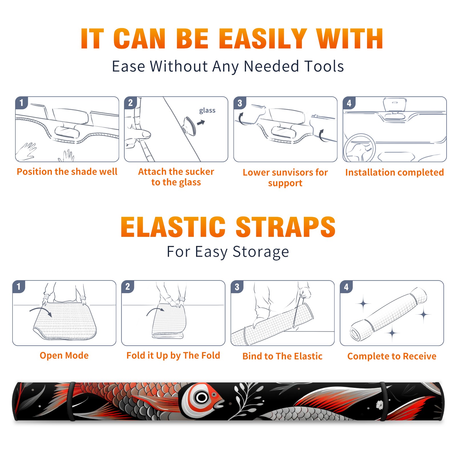 </b>ZXIVGOQFR Foldable Premium Car Windshield Sunshade is your great solution to reduce your car’s interior temperature dramatically! This is definitely a must-have item for your summer travel! </b> <br> ●</b>Size: 63"L x 33.5"W </b> <br> ●</b>Blocking Uv Rays & Heat Insulation</b><br> Our vehicle sunshade provides effective UV, sun, and summer heat protection .Maintains dashboards by preventing fading and cracking <br> ●</b>Easy-To-Store Folding Design Makes Storage Convenient </b><br> ZXIVGOQFR car sunshades come with removable suction cups and elastic bands that you can install easily and quickly, and the removable suction cups will not leave any marks on your windows when removed. Within seconds, windshield visor can be installed and removed. When not in use,the front windshield can be easily and effectively placed on the door pocket or the dashboard, which is beautiful and does not take up space in the car.<br> <br> </b>PUT UP A 'PROTECTIVE UMBRELLA' FOR YOUR BELOVED CAR!</b>
