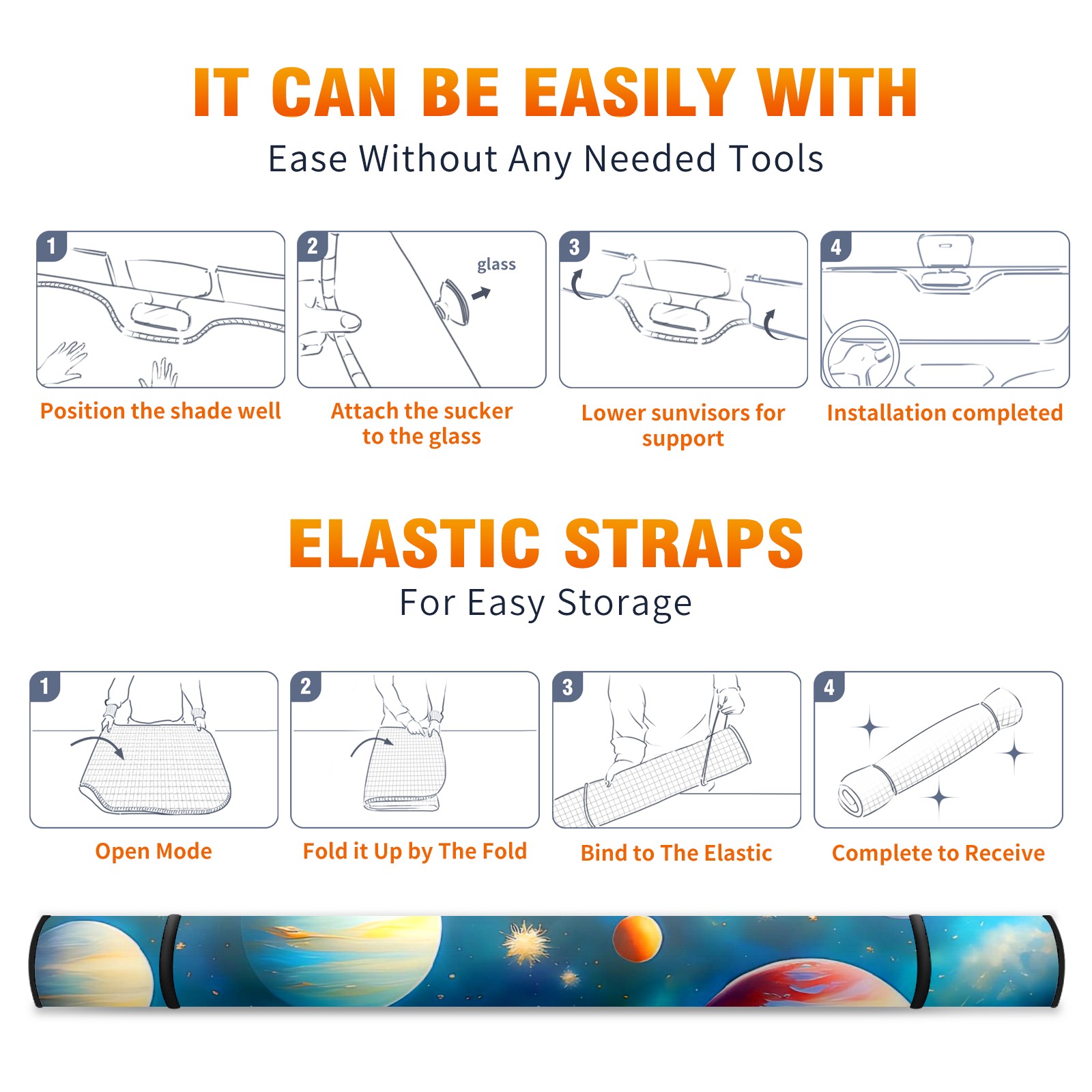 </b>ZXIVGOQFR Foldable Premium Car Windshield Sunshade is your great solution to reduce your car’s interior temperature dramatically! This is definitely a must-have item for your summer travel! </b> <br> ●</b>Size: 63"L x 33.5"W </b> <br> ●</b>Blocking Uv Rays & Heat Insulation</b><br> Our vehicle sunshade provides effective UV, sun, and summer heat protection .Maintains dashboards by preventing fading and cracking <br> ●</b>Easy-To-Store Folding Design Makes Storage Convenient </b><br> ZXIVGOQFR car sunshades come with removable suction cups and elastic bands that you can install easily and quickly, and the removable suction cups will not leave any marks on your windows when removed. Within seconds, windshield visor can be installed and removed. When not in use,the front windshield can be easily and effectively placed on the door pocket or the dashboard, which is beautiful and does not take up space in the car.<br> <br> </b>PUT UP A 'PROTECTIVE UMBRELLA' FOR YOUR BELOVED CAR!</b>