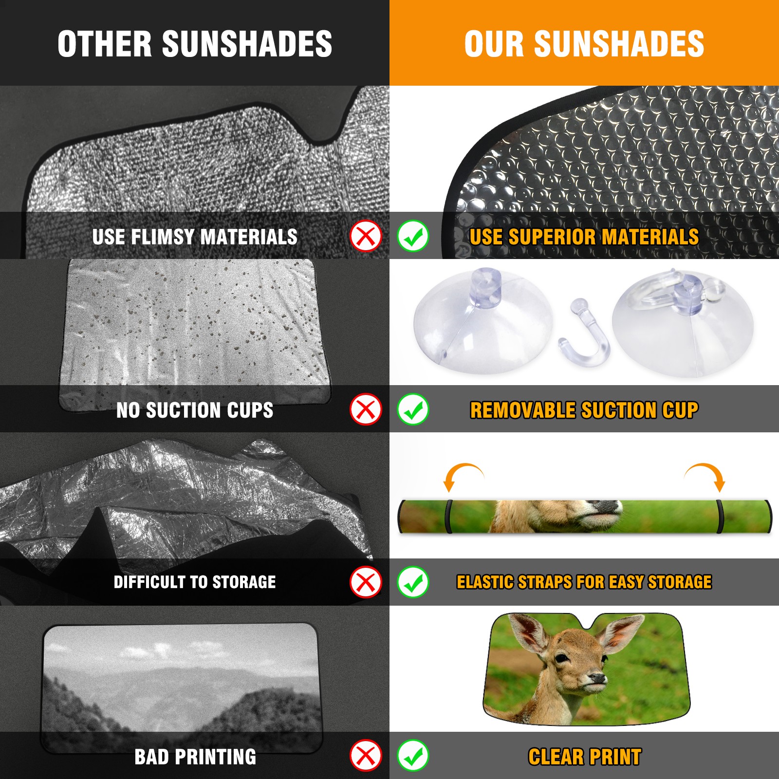 </b>ZXIVGOQFR Foldable Premium Car Windshield Sunshade is your great solution to reduce your car’s interior temperature dramatically! This is definitely a must-have item for your summer travel! </b> <br> ●</b>Size: 63"L x 33.5"W </b> <br> ●</b>Blocking Uv Rays & Heat Insulation</b><br> Our vehicle sunshade provides effective UV, sun, and summer heat protection .Maintains dashboards by preventing fading and cracking <br> ●</b>Easy-To-Store Folding Design Makes Storage Convenient </b><br> ZXIVGOQFR car sunshades come with removable suction cups and elastic bands that you can install easily and quickly, and the removable suction cups will not leave any marks on your windows when removed. Within seconds, windshield visor can be installed and removed. When not in use,the front windshield can be easily and effectively placed on the door pocket or the dashboard, which is beautiful and does not take up space in the car.<br> <br> </b>PUT UP A 'PROTECTIVE UMBRELLA' FOR YOUR BELOVED CAR!</b>