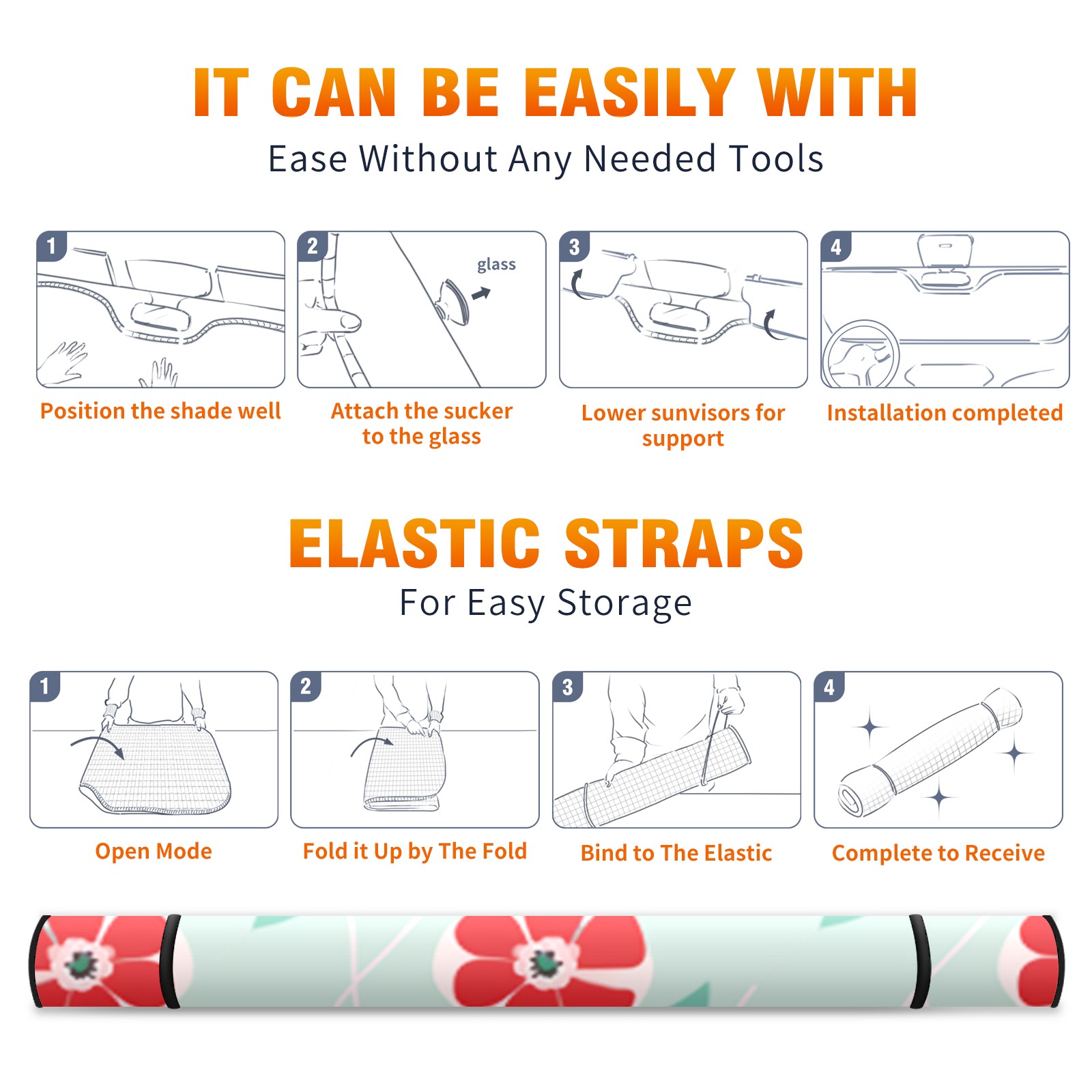 </b>ZXIVGOQFR Foldable Premium Car Windshield Sunshade is your great solution to reduce your car’s interior temperature dramatically! This is definitely a must-have item for your summer travel! </b> <br> ●</b>Size: 63"L x 33.5"W </b> <br> ●</b>Blocking Uv Rays & Heat Insulation</b><br> Our vehicle sunshade provides effective UV, sun, and summer heat protection .Maintains dashboards by preventing fading and cracking <br> ●</b>Easy-To-Store Folding Design Makes Storage Convenient </b><br> ZXIVGOQFR car sunshades come with removable suction cups and elastic bands that you can install easily and quickly, and the removable suction cups will not leave any marks on your windows when removed. Within seconds, windshield visor can be installed and removed. When not in use,the front windshield can be easily and effectively placed on the door pocket or the dashboard, which is beautiful and does not take up space in the car.<br> <br> </b>PUT UP A 'PROTECTIVE UMBRELLA' FOR YOUR BELOVED CAR!</b>