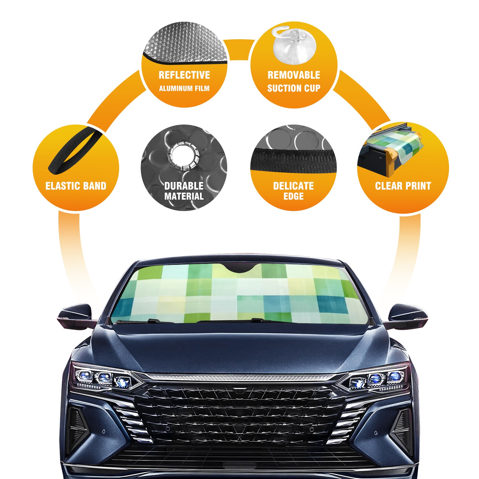 </b>ZXIVGOQFR Foldable Premium Car Windshield Sunshade is your great solution to reduce your car’s interior temperature dramatically! This is definitely a must-have item for your summer travel! </b> <br> ●</b>Size: 63"L x 33.5"W </b> <br> ●</b>Blocking Uv Rays & Heat Insulation</b><br> Our vehicle sunshade provides effective UV, sun, and summer heat protection .Maintains dashboards by preventing fading and cracking <br> ●</b>Easy-To-Store Folding Design Makes Storage Convenient </b><br> ZXIVGOQFR car sunshades come with removable suction cups and elastic bands that you can install easily and quickly, and the removable suction cups will not leave any marks on your windows when removed. Within seconds, windshield visor can be installed and removed. When not in use,the front windshield can be easily and effectively placed on the door pocket or the dashboard, which is beautiful and does not take up space in the car.<br> <br> </b>PUT UP A 'PROTECTIVE UMBRELLA' FOR YOUR BELOVED CAR!</b>