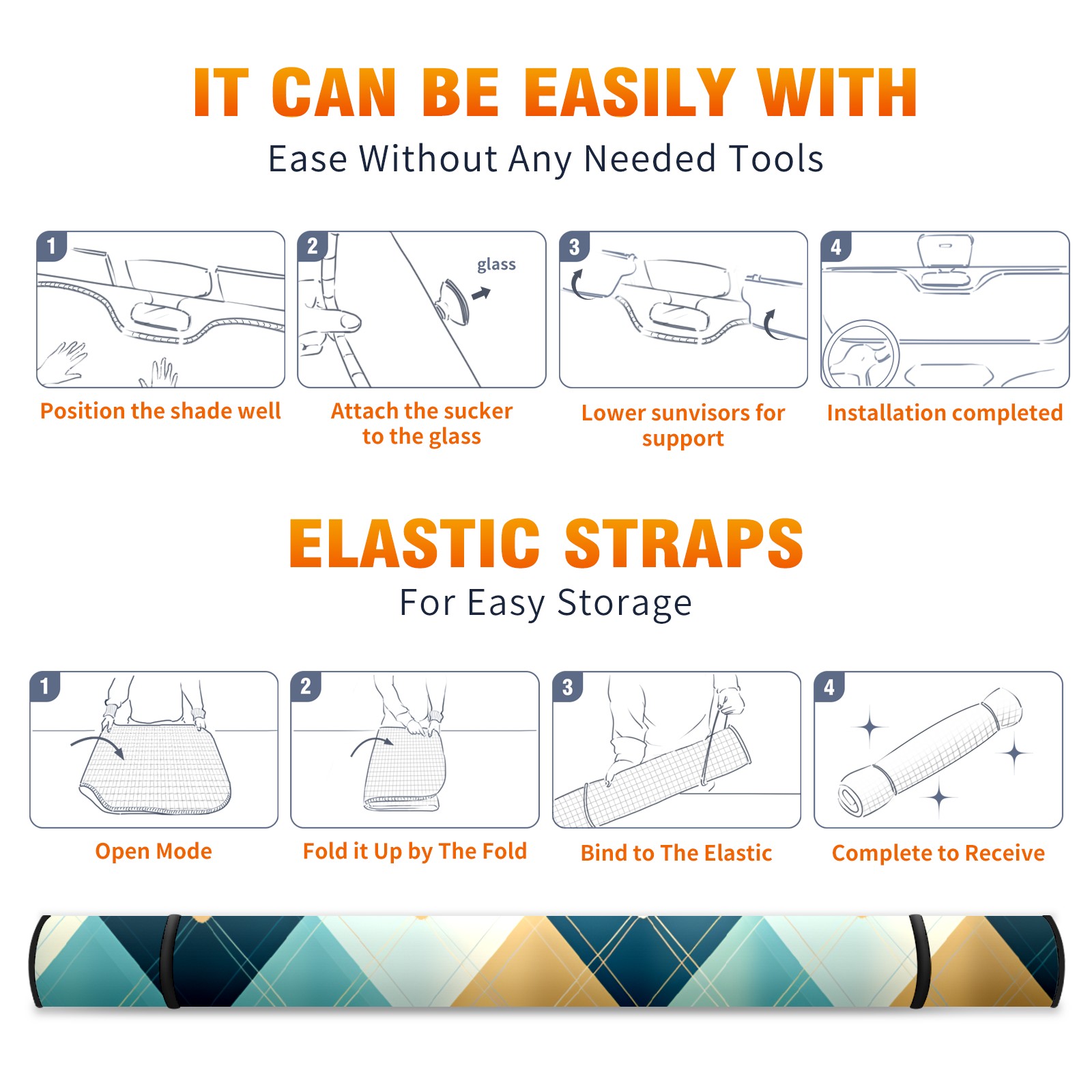 </b>ZXIVGOQFR Foldable Premium Car Windshield Sunshade is your great solution to reduce your car’s interior temperature dramatically! This is definitely a must-have item for your summer travel! </b> <br> ●</b>Size: 63"L x 33.5"W </b> <br> ●</b>Blocking Uv Rays & Heat Insulation</b><br> Our vehicle sunshade provides effective UV, sun, and summer heat protection .Maintains dashboards by preventing fading and cracking <br> ●</b>Easy-To-Store Folding Design Makes Storage Convenient </b><br> ZXIVGOQFR car sunshades come with removable suction cups and elastic bands that you can install easily and quickly, and the removable suction cups will not leave any marks on your windows when removed. Within seconds, windshield visor can be installed and removed. When not in use,the front windshield can be easily and effectively placed on the door pocket or the dashboard, which is beautiful and does not take up space in the car.<br> <br> </b>PUT UP A 'PROTECTIVE UMBRELLA' FOR YOUR BELOVED CAR!</b>