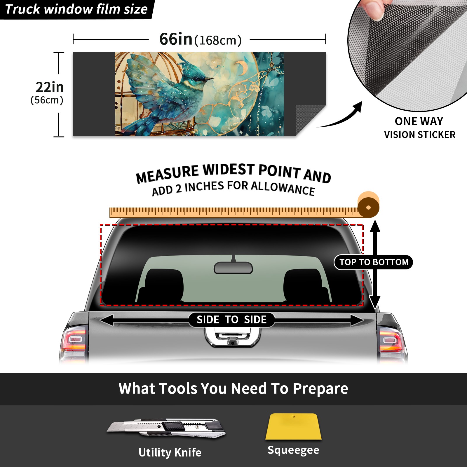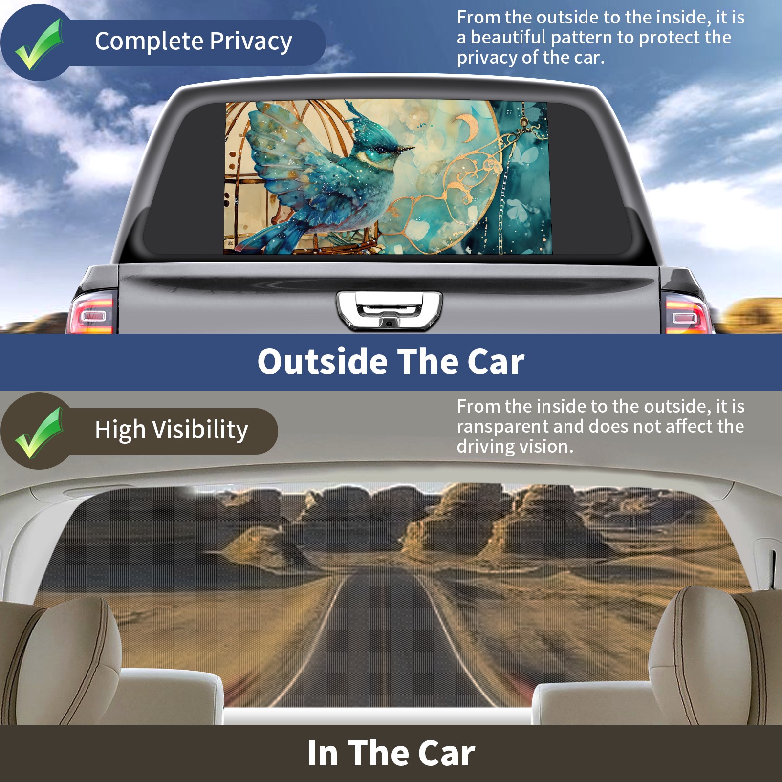 </b>Window film one-way light transmission Protect your privacy while allowing you to enjoy the scenery outside your window!</b> <br> </b>●Decals Instructions Usage--Teach You To Use Quickly</b> <br> 1.Clean the window galss thoroughly <br> 2.Use a Squeegee or other card to scrape off the remaining water and bumps(don't use too much force) <br> 3.Remove the film's back cover .Use a knife to cut out a suitable contour and wipe off the remaining water(you can also use a hair dryer to blow dry) <br> 4.Find a suitable location and stick a sticker <br> </b>●Unique Design</b> <br> ZXIVGOQFR Back window stickers ‘s smart looking and unique cute design makes your vehicle special under sunshine. Makes your car easy to identify, perfect for finding your car in crowded parking lots and garages.funny visor reflects personality and attitude. <br> </b>●Perfect Gift for all Drivers<br></b> We create all the gifts and accessories you only need to choose what you like. Get full tailgate wraps, rear window decals, and everything you need to make your pickup truck look awesome. <br> </b> Decorate Your Pickup Truck With Touches Today!</b>