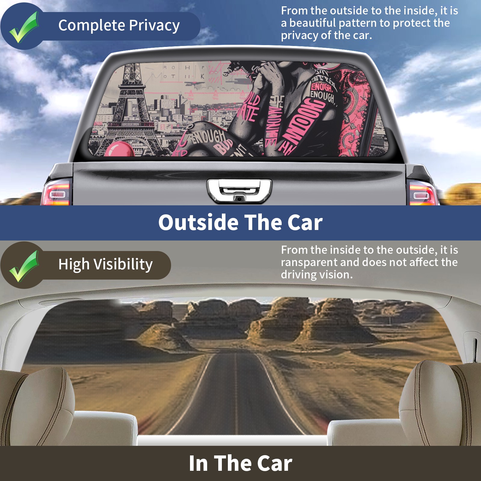• </b>Window film one-way light transmission Protect your privacy while allowing you to enjoy the scenery outside your window!</b> <br> </b>●Decals Instructions Usage--Teach You To Use Quickly</b> <br> 1.Clean the window galss thoroughly <br> 2.Use a Squeegee or other card to scrape off the remaining water and bumps(don't use too much force) <br> 3.Remove the film's back cover .Use a knife to cut out a suitable contour and wipe off the remaining water(you can also use a hair dryer to blow dry) <br> 4.Find a suitable location and stick a sticker <br> </b>●Unique Design</b> <br> ZXIVGOQFR Back window stickers ‘s smart looking and unique cute design makes your vehicle special under sunshine. Makes your car easy to identify, perfect for finding your car in crowded parking lots and garages.funny visor reflects personality and attitude. <br> </b>●Perfect Gift for all Drivers<br></b> We create all the gifts and accessories you only need to choose what you like. Get full tailgate wraps, rear window decals, and everything you need to make your pickup truck look awesome. <br> </b> Decorate Your Pickup Truck With Touches Today!</b>