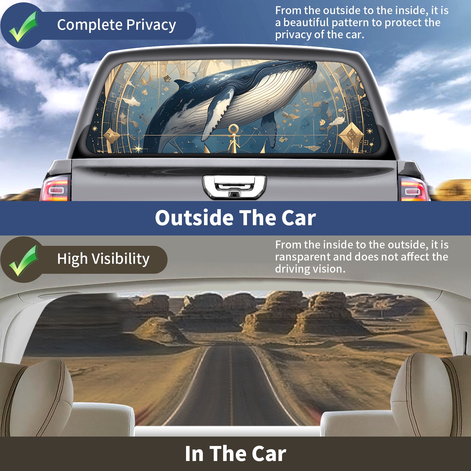 </b>Window film one-way light transmission Protect your privacy while allowing you to enjoy the scenery outside your window!</b> <br> </b>●Decals Instructions Usage--Teach You To Use Quickly</b> <br> 1.Clean the window galss thoroughly <br> 2.Use a Squeegee or other card to scrape off the remaining water and bumps(don't use too much force) <br> 3.Remove the film's back cover .Use a knife to cut out a suitable contour and wipe off the remaining water(you can also use a hair dryer to blow dry) <br> 4.Find a suitable location and stick a sticker <br> </b>●Unique Design</b> <br> ZXIVGOQFR Back window stickers ‘s smart looking and unique cute design makes your vehicle special under sunshine. Makes your car easy to identify, perfect for finding your car in crowded parking lots and garages.funny visor reflects personality and attitude. <br> </b>●Perfect Gift for all Drivers<br></b> We create all the gifts and accessories you only need to choose what you like. Get full tailgate wraps, rear window decals, and everything you need to make your pickup truck look awesome. <br> </b> Decorate Your Pickup Truck With Touches Today!</b>