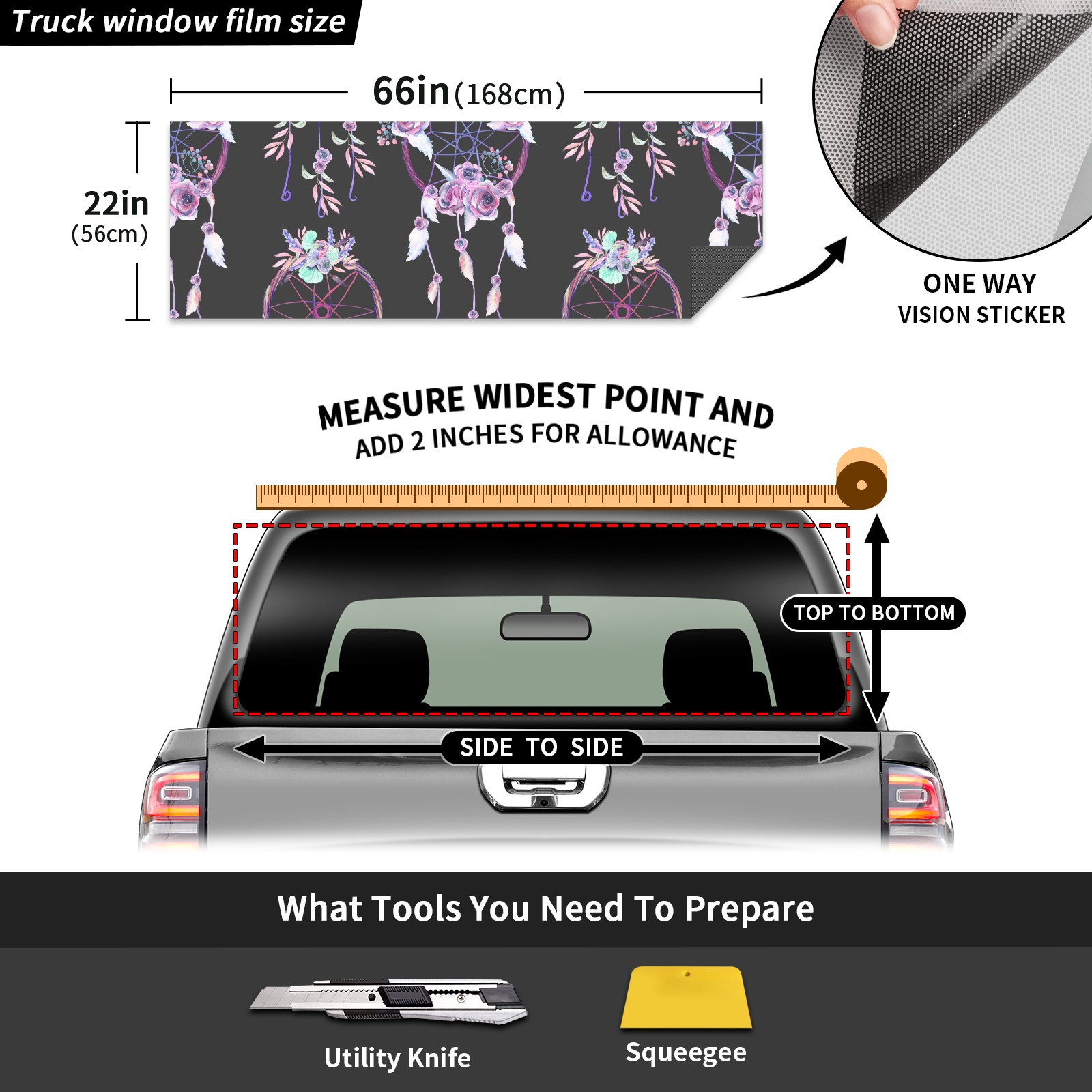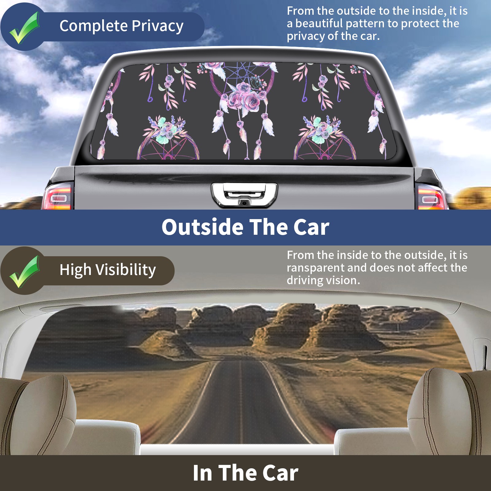 Truck Rear Window Graphics Decals Pickup Trucks Back Window Sticker Full Window Film Decal One Way Visual Waterproof Car Rear Tint Pink Dreamcatcher Floral