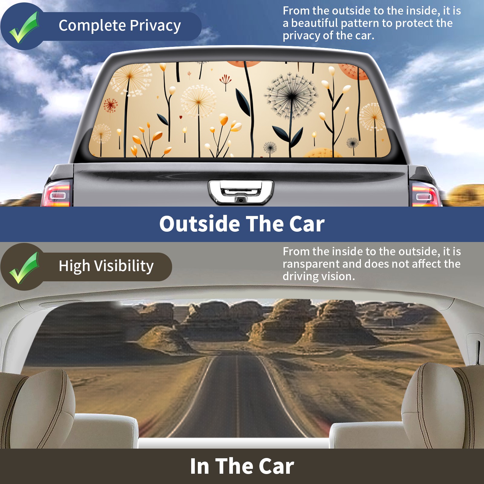 Truck Rear Window Graphics Decals Pickup Trucks Back Window Sticker Full Window Film Decal One Way Visual Waterproof Car Rear Tint Dandelions