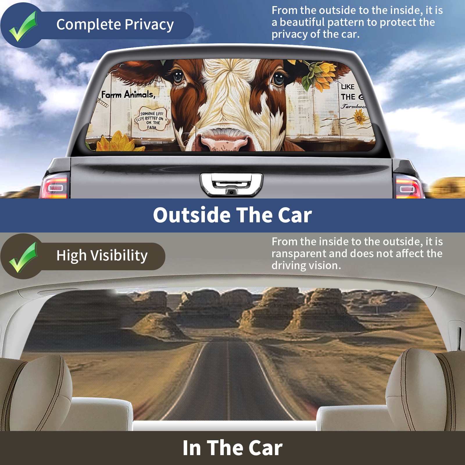 </b>Window film one-way light transmission Protect your privacy while allowing you to enjoy the scenery outside your window!</b> <br> </b>●Decals Instructions Usage--Teach You To Use Quickly</b> <br> 1.Clean the window galss thoroughly <br> 2.Use a Squeegee or other card to scrape off the remaining water and bumps(don't use too much force) <br> 3.Remove the film's back cover .Use a knife to cut out a suitable contour and wipe off the remaining water(you can also use a hair dryer to blow dry) <br> 4.Find a suitable location and stick a sticker <br> </b>●Unique Design</b> <br> ZXIVGOQFR Back window stickers ‘s smart looking and unique cute design makes your vehicle special under sunshine. Makes your car easy to identify, perfect for finding your car in crowded parking lots and garages.funny visor reflects personality and attitude. <br> </b>●Perfect Gift for all Drivers<br></b> We create all the gifts and accessories you only need to choose what you like. Get full tailgate wraps, rear window decals, and everything you need to make your pickup truck look awesome. <br> </b> Decorate Your Pickup Truck With Touches Today!</b>