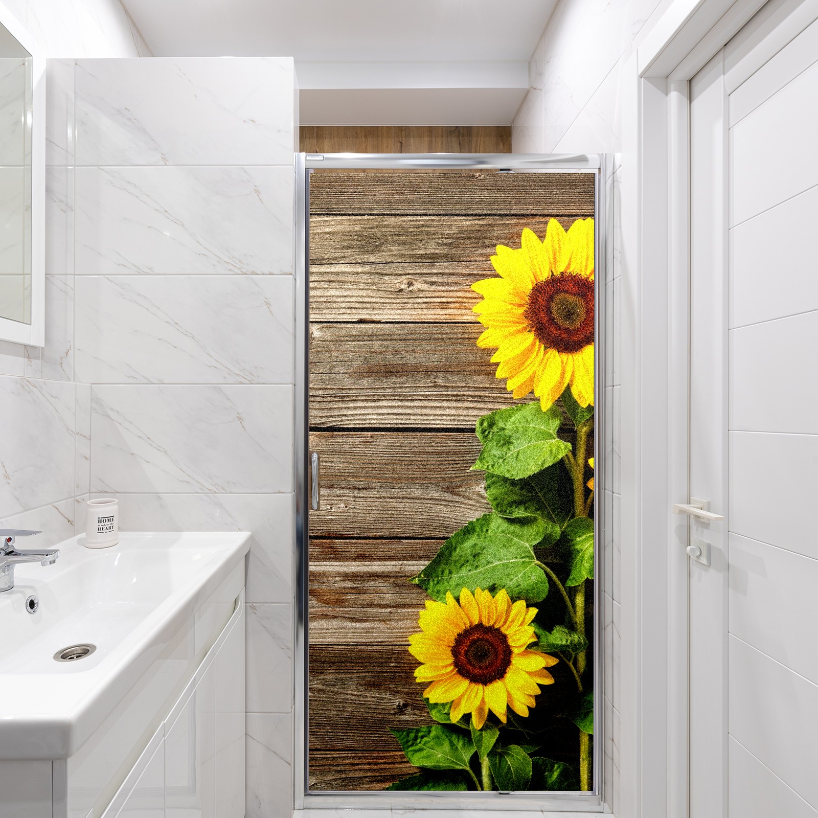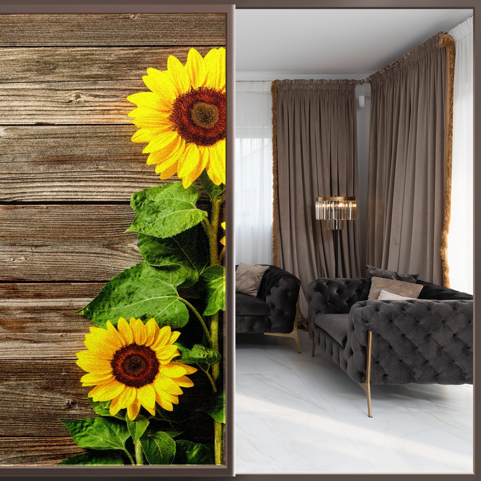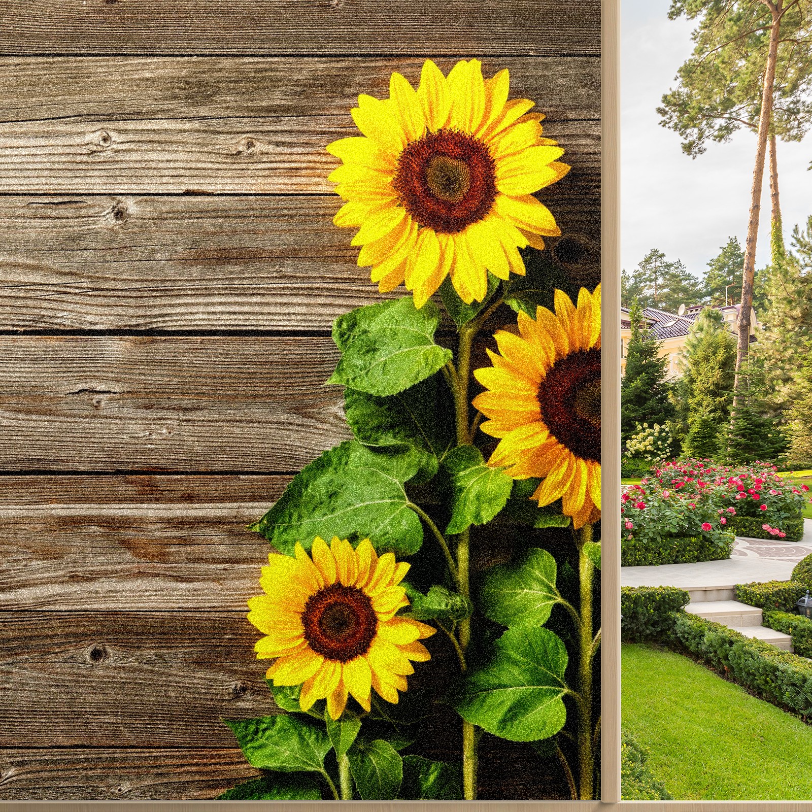 MSINMKOK Window Privacy Film Realistic Sunflowers Floral Wood Texture Decorative Frosted Glass Window Film for Glass Door Bathroom Window 17.7'' x 23.6'' Non-Adhesive Window Decals Stickers