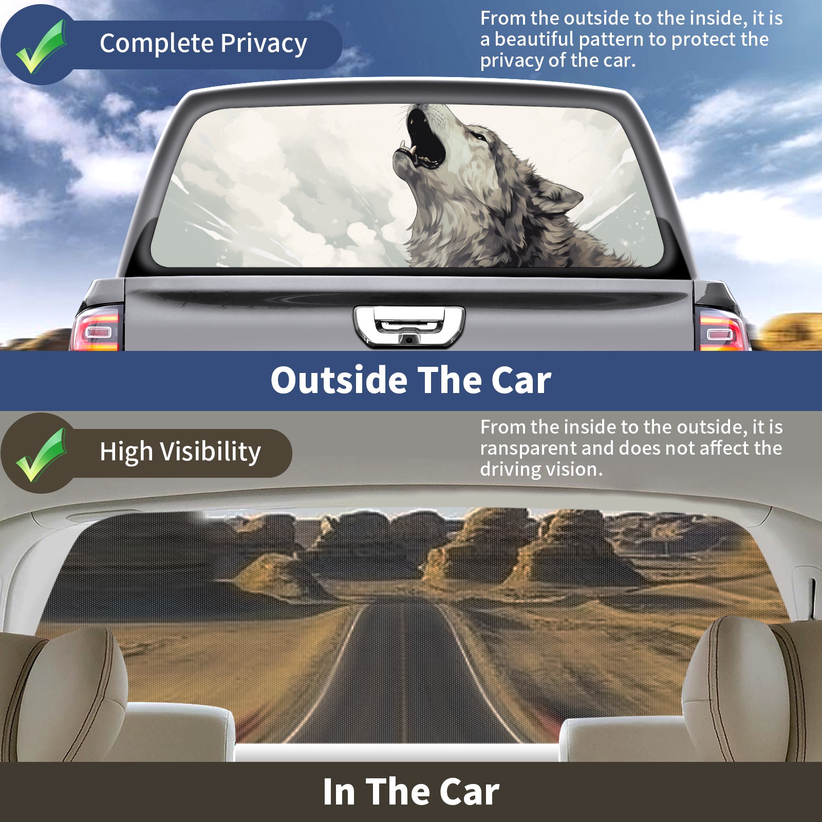 </b>Window film one-way light transmission Protect your privacy while allowing you to enjoy the scenery outside your window!</b> <br> </b>●Decals Instructions Usage--Teach You To Use Quickly</b> <br> 1.Clean the window galss thoroughly <br> 2.Use a Squeegee or other card to scrape off the remaining water and bumps(don't use too much force) <br> 3.Remove the film's back cover .Use a knife to cut out a suitable contour and wipe off the remaining water(you can also use a hair dryer to blow dry) <br> 4.Find a suitable location and stick a sticker <br> </b>●Unique Design</b> <br> ZXIVGOQFR Back window stickers ‘s smart looking and unique cute design makes your vehicle special under sunshine. Makes your car easy to identify, perfect for finding your car in crowded parking lots and garages.funny visor reflects personality and attitude. <br> </b>●Perfect Gift for all Drivers<br></b> We create all the gifts and accessories you only need to choose what you like. Get full tailgate wraps, rear window decals, and everything you need to make your pickup truck look awesome. <br> </b> Decorate Your Pickup Truck With Touches Today!</b>