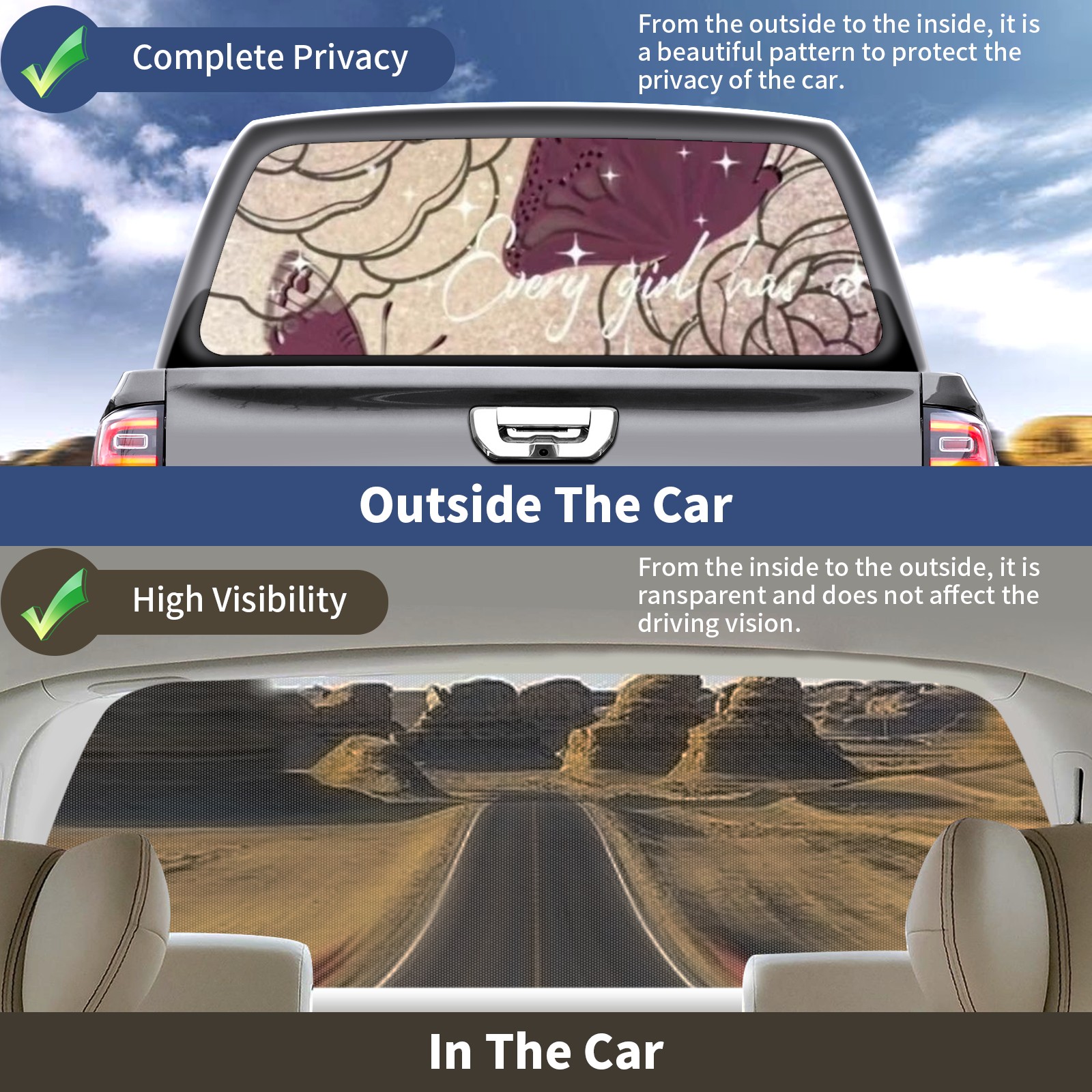 </b>Window film one-way light transmission Protect your privacy while allowing you to enjoy the scenery outside your window!</b> <br> </b>●Decals Instructions Usage--Teach You To Use Quickly</b> <br> 1.Clean the window galss thoroughly <br> 2.Use a Squeegee or other card to scrape off the remaining water and bumps(don't use too much force) <br> 3.Remove the film's back cover .Use a knife to cut out a suitable contour and wipe off the remaining water(you can also use a hair dryer to blow dry) <br> 4.Find a suitable location and stick a sticker <br> </b>●Unique Design</b> <br> ZXIVGOQFR Back window stickers ‘s smart looking and unique cute design makes your vehicle special under sunshine. Makes your car easy to identify, perfect for finding your car in crowded parking lots and garages.funny visor reflects personality and attitude. <br> </b>●Perfect Gift for all Drivers<br></b> We create all the gifts and accessories you only need to choose what you like. Get full tailgate wraps, rear window decals, and everything you need to make your pickup truck look awesome. <br> </b> Decorate Your Pickup Truck With Touches Today!</b>