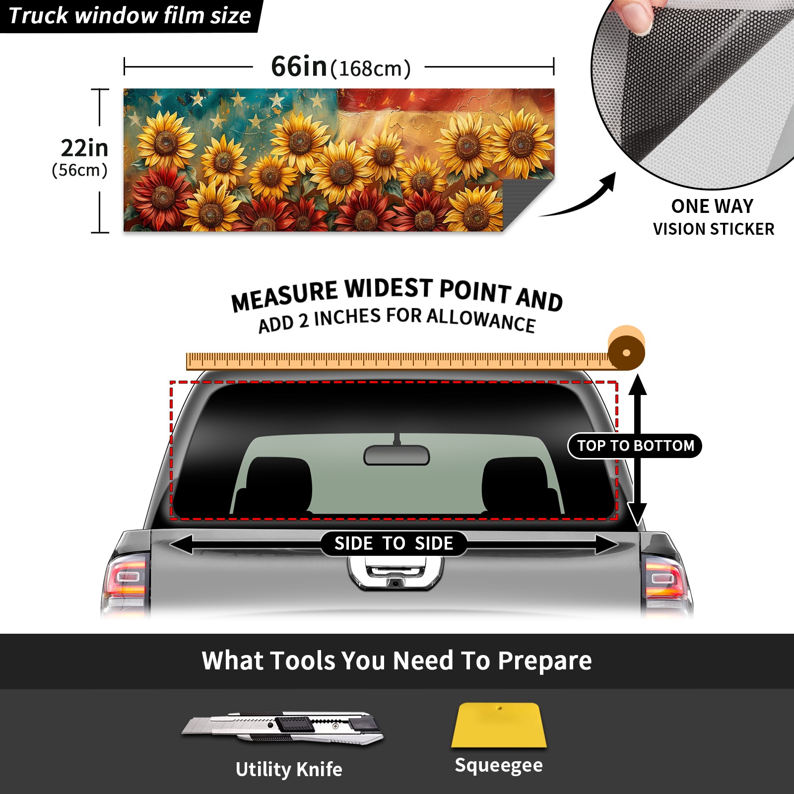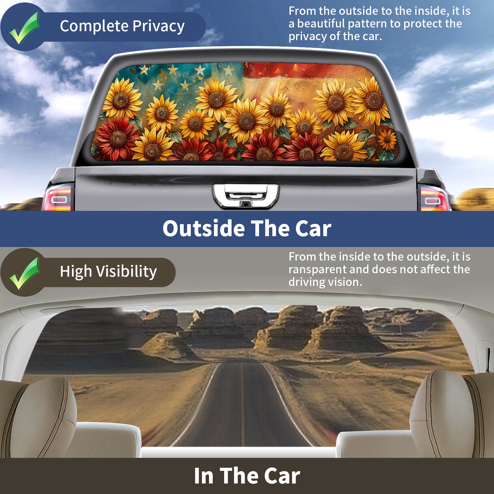 </b>Window film one-way light transmission Protect your privacy while allowing you to enjoy the scenery outside your window!</b> <br> </b>●Decals Instructions Usage--Teach You To Use Quickly</b> <br> 1.Clean the window galss thoroughly <br> 2.Use a Squeegee or other card to scrape off the remaining water and bumps(don't use too much force) <br> 3.Remove the film's back cover .Use a knife to cut out a suitable contour and wipe off the remaining water(you can also use a hair dryer to blow dry) <br> 4.Find a suitable location and stick a sticker <br> </b>●Unique Design</b> <br> ZXIVGOQFR Back window stickers ‘s smart looking and unique cute design makes your vehicle special under sunshine. Makes your car easy to identify, perfect for finding your car in crowded parking lots and garages.funny visor reflects personality and attitude. <br> </b>●Perfect Gift for all Drivers<br></b> We create all the gifts and accessories you only need to choose what you like. Get full tailgate wraps, rear window decals, and everything you need to make your pickup truck look awesome. <br> </b> Decorate Your Pickup Truck With Touches Today!</b>