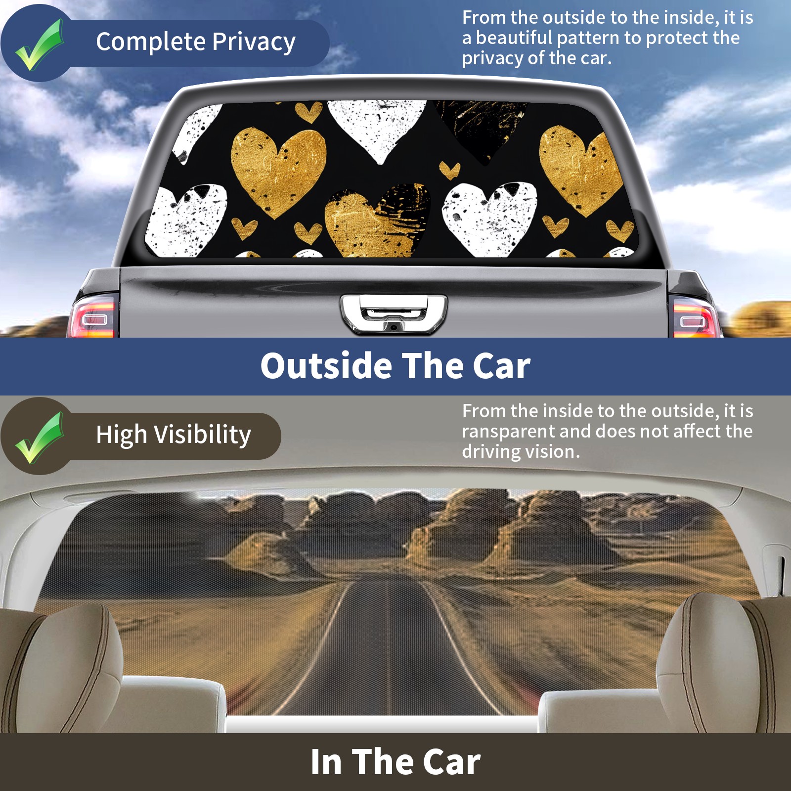 </b>Window film one-way light transmission Protect your privacy while allowing you to enjoy the scenery outside your window!</b> <br> </b>●Decals Instructions Usage--Teach You To Use Quickly</b> <br> 1.Clean the window galss thoroughly <br> 2.Use a Squeegee or other card to scrape off the remaining water and bumps(don't use too much force) <br> 3.Remove the film's back cover .Use a knife to cut out a suitable contour and wipe off the remaining water(you can also use a hair dryer to blow dry) <br> 4.Find a suitable location and stick a sticker <br> </b>●Unique Design</b> <br> ZXIVGOQFR Back window stickers ‘s smart looking and unique cute design makes your vehicle special under sunshine. Makes your car easy to identify, perfect for finding your car in crowded parking lots and garages.funny visor reflects personality and attitude. <br> </b>●Perfect Gift for all Drivers<br></b> We create all the gifts and accessories you only need to choose what you like. Get full tailgate wraps, rear window decals, and everything you need to make your pickup truck look awesome. <br> </b> Decorate Your Pickup Truck With Touches Today!</b>