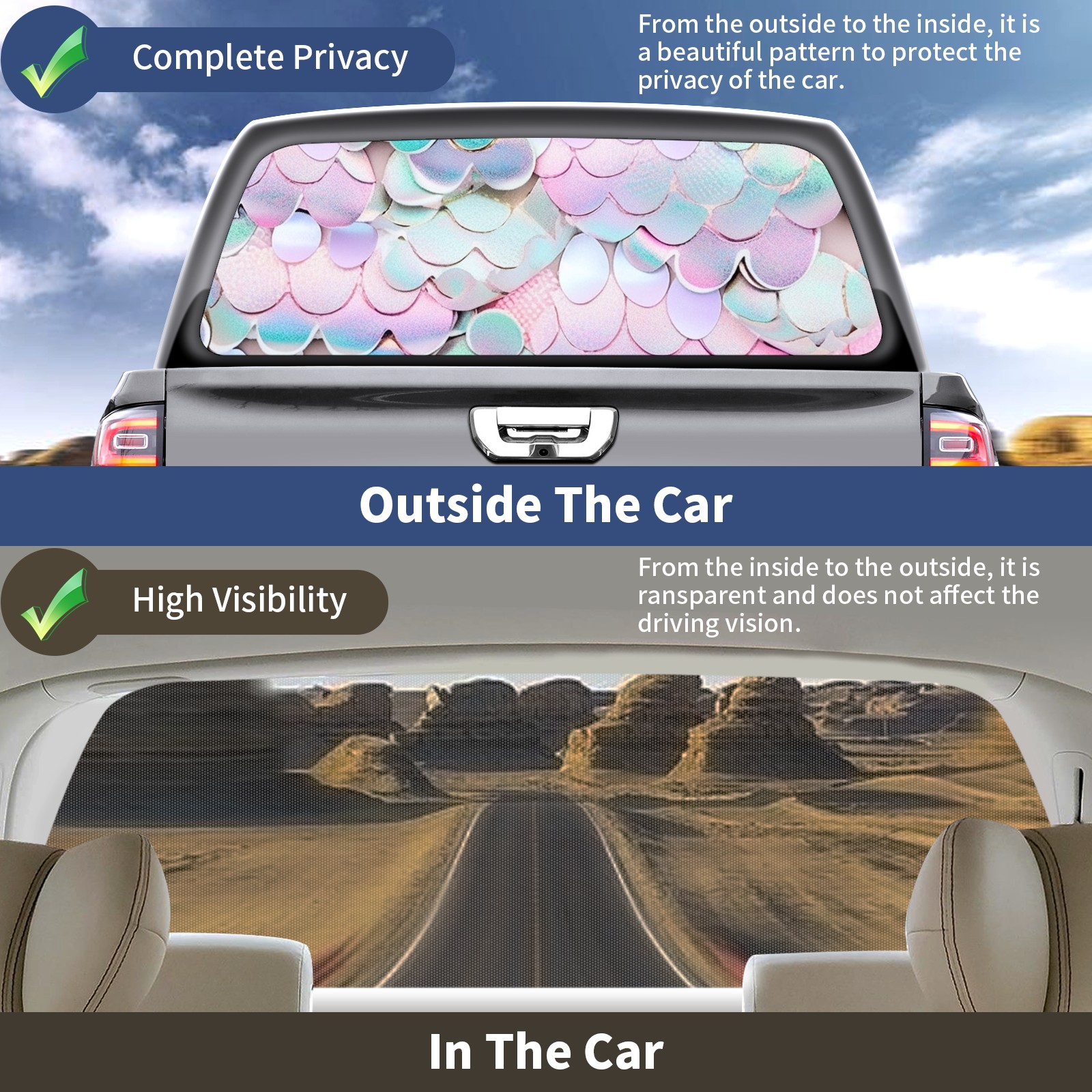 </b>Window film one-way light transmission Protect your privacy while allowing you to enjoy the scenery outside your window!</b> <br> </b>●Decals Instructions Usage--Teach You To Use Quickly</b> <br> 1.Clean the window galss thoroughly <br> 2.Use a Squeegee or other card to scrape off the remaining water and bumps(don't use too much force) <br> 3.Remove the film's back cover .Use a knife to cut out a suitable contour and wipe off the remaining water(you can also use a hair dryer to blow dry) <br> 4.Find a suitable location and stick a sticker <br> </b>●Unique Design</b> <br> ZXIVGOQFR Back window stickers ‘s smart looking and unique cute design makes your vehicle special under sunshine. Makes your car easy to identify, perfect for finding your car in crowded parking lots and garages.funny visor reflects personality and attitude. <br> </b>●Perfect Gift for all Drivers<br></b> We create all the gifts and accessories you only need to choose what you like. Get full tailgate wraps, rear window decals, and everything you need to make your pickup truck look awesome. <br> </b> Decorate Your Pickup Truck With Touches Today!</b>