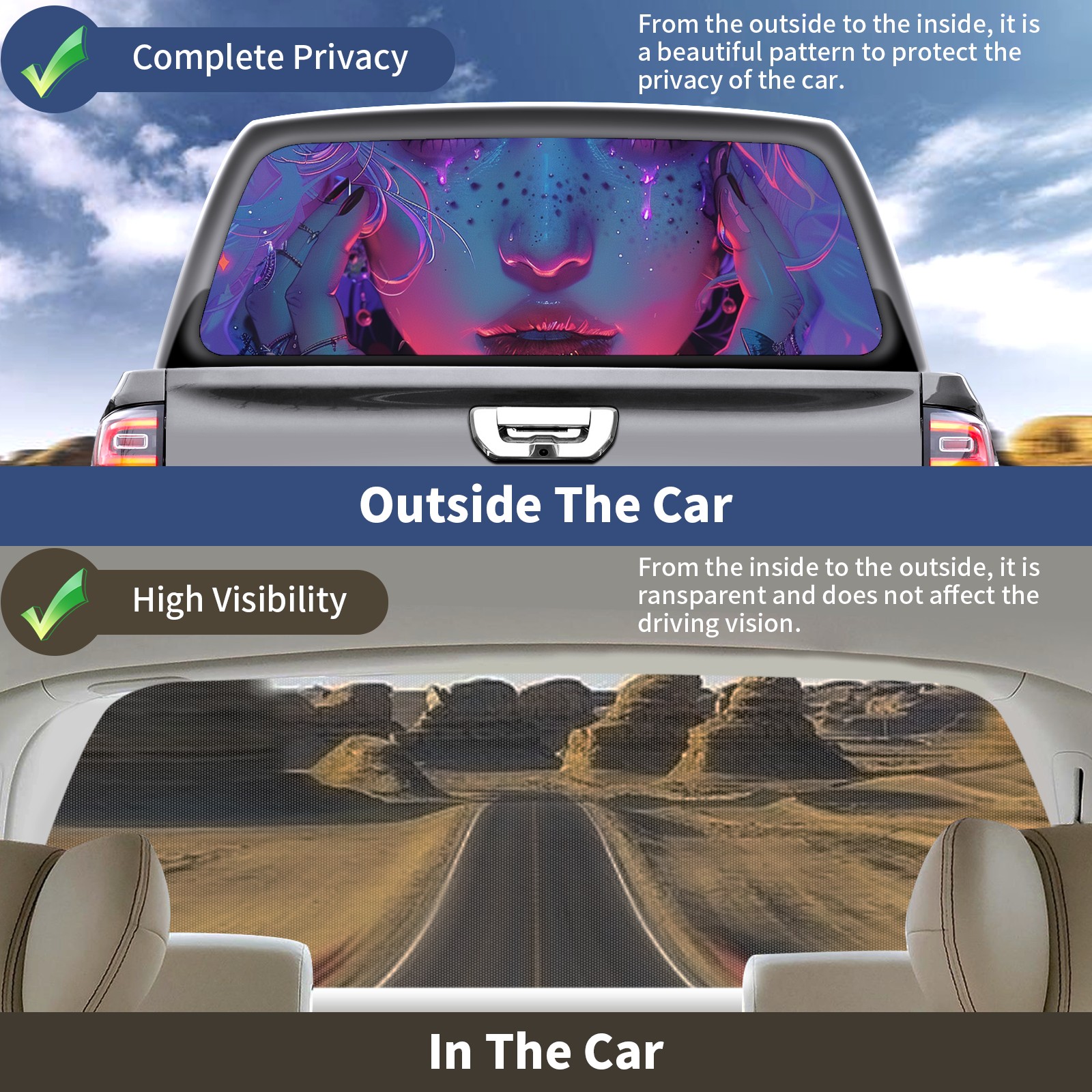 • </b>Window film one-way light transmission Protect your privacy while allowing you to enjoy the scenery outside your window!</b> <br> </b>●Decals Instructions Usage--Teach You To Use Quickly</b> <br> 1.Clean the window galss thoroughly <br> 2.Use a Squeegee or other card to scrape off the remaining water and bumps(don't use too much force) <br> 3.Remove the film's back cover .Use a knife to cut out a suitable contour and wipe off the remaining water(you can also use a hair dryer to blow dry) <br> 4.Find a suitable location and stick a sticker <br> </b>●Unique Design</b> <br> ZXIVGOQFR Back window stickers ‘s smart looking and unique cute design makes your vehicle special under sunshine. Makes your car easy to identify, perfect for finding your car in crowded parking lots and garages.funny visor reflects personality and attitude. <br> </b>●Perfect Gift for all Drivers<br></b> We create all the gifts and accessories you only need to choose what you like. Get full tailgate wraps, rear window decals, and everything you need to make your pickup truck look awesome. <br> </b> Decorate Your Pickup Truck With Rear Window Decal Today!</b>