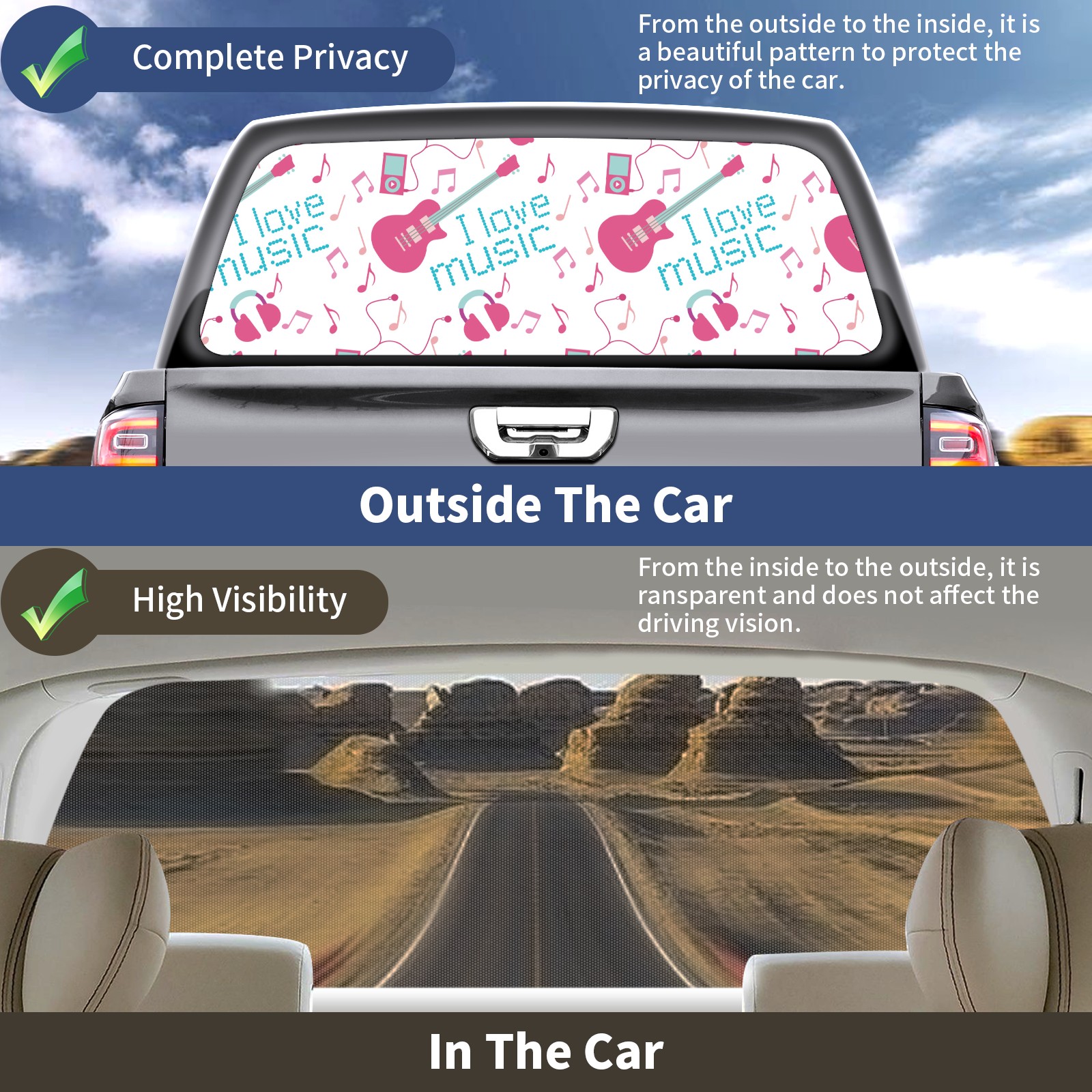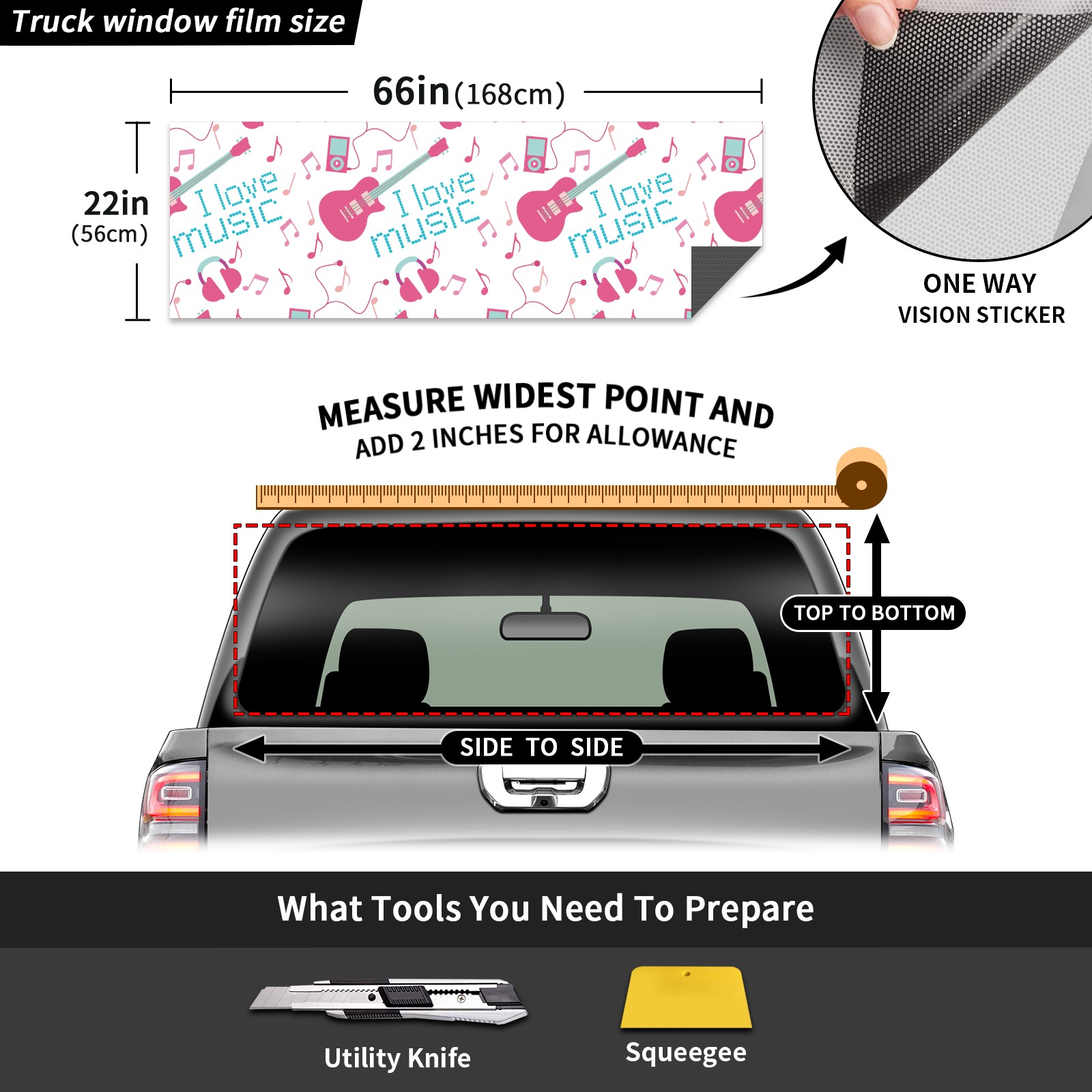 Truck Rear Window Graphics Decals Pickup Trucks Back Window Sticker Full Window Film Decal One Way Visual Waterproof Car Rear Tint guitar music