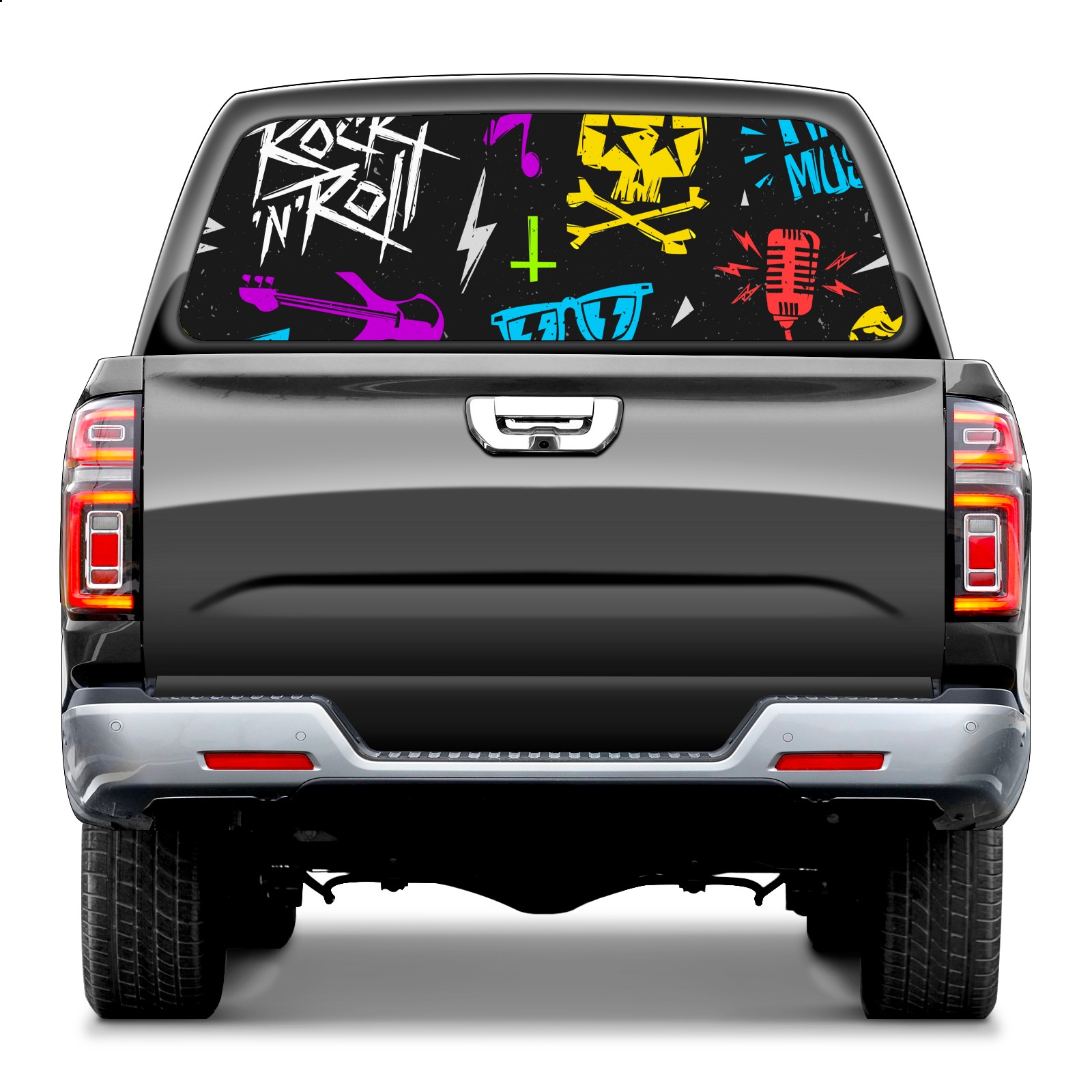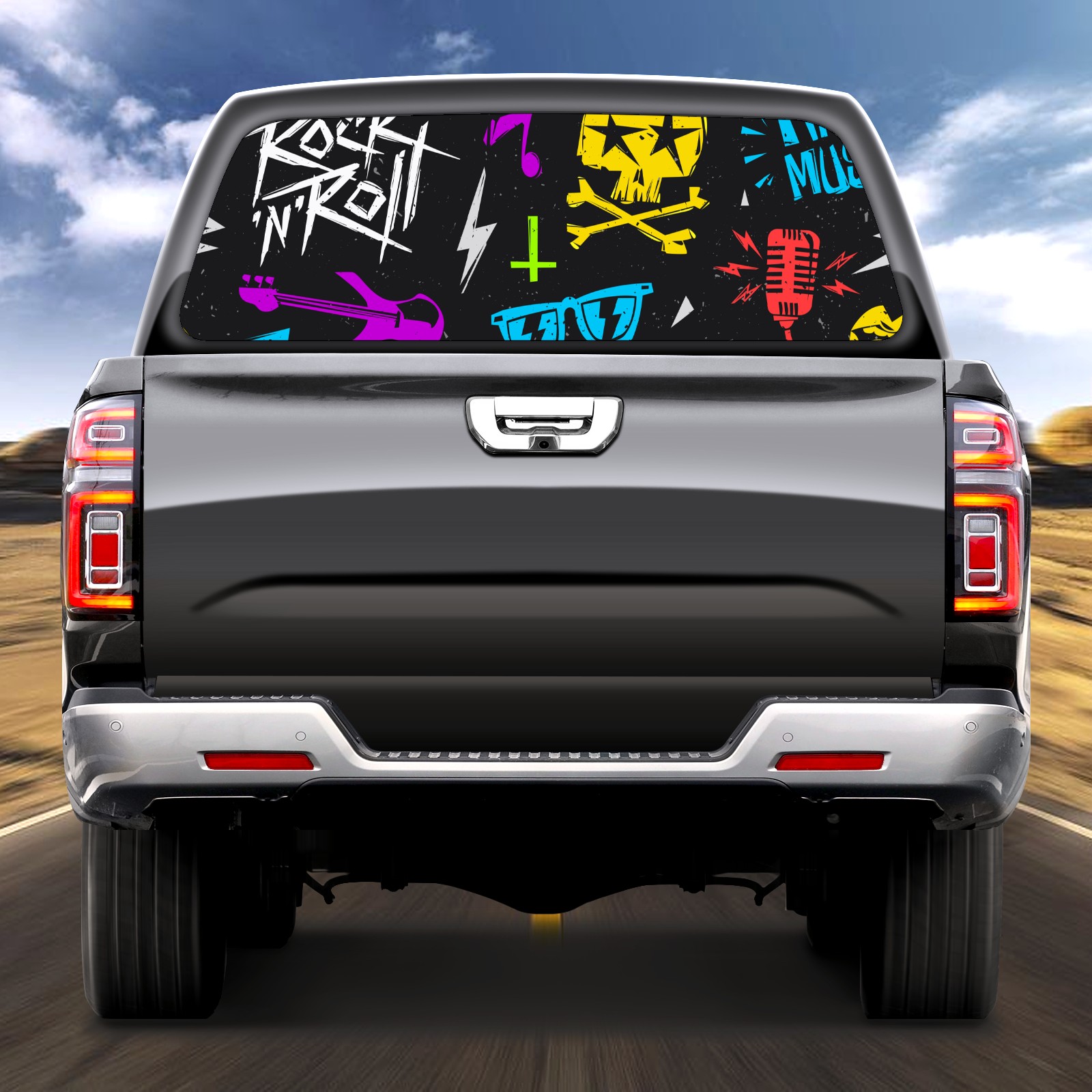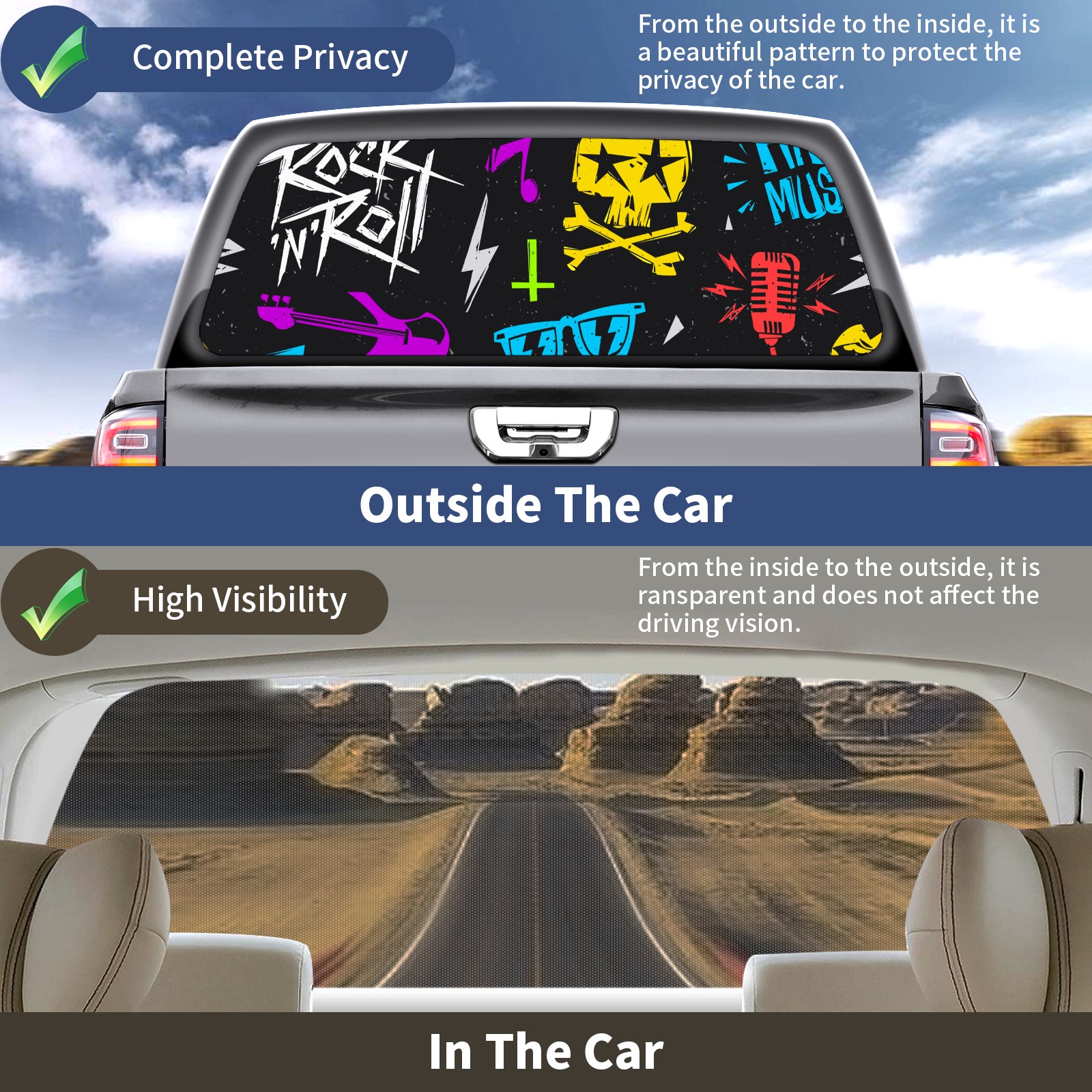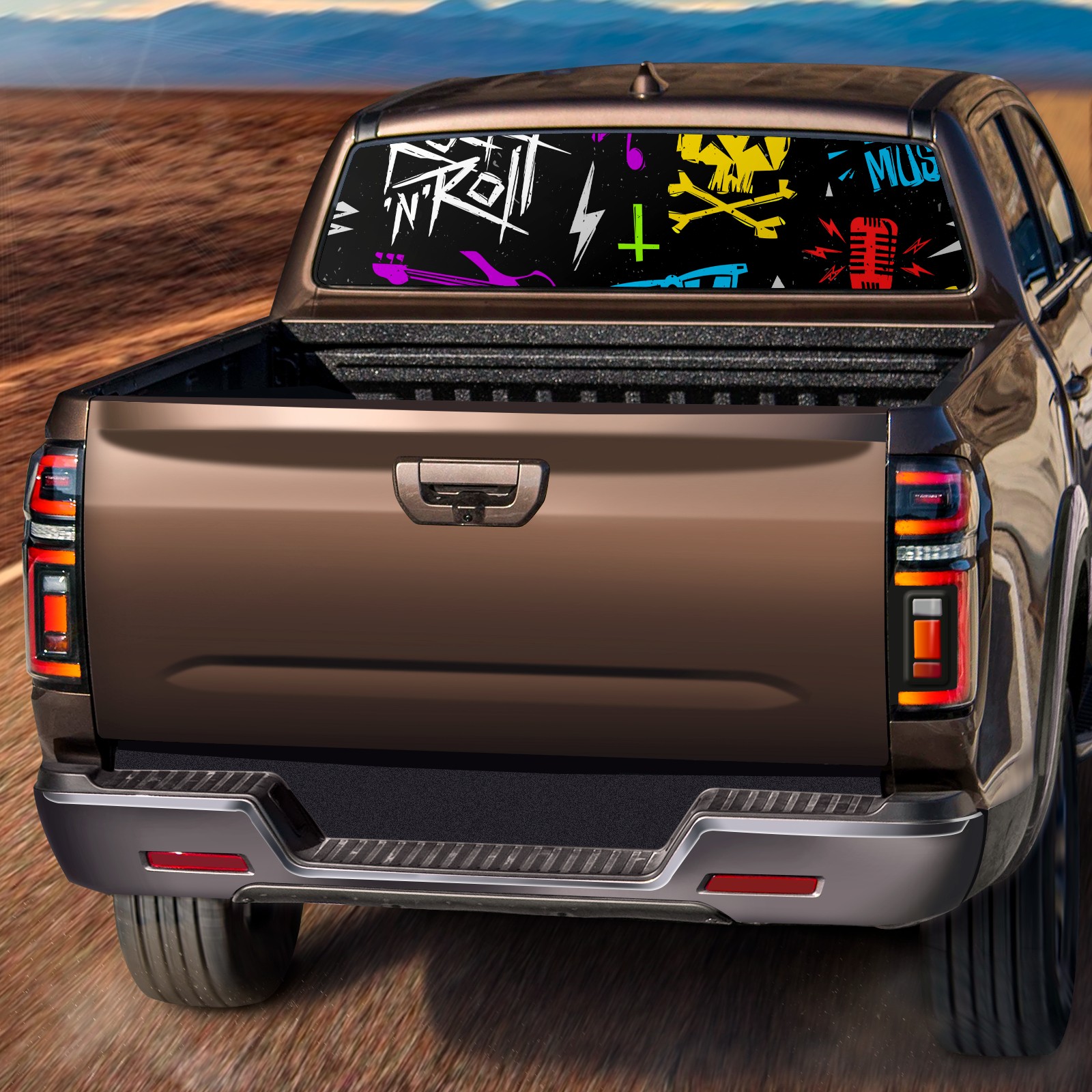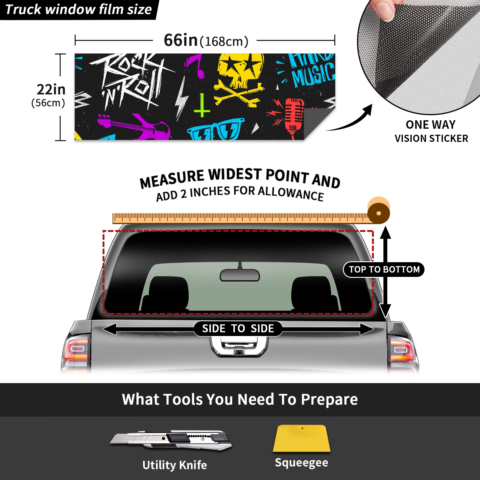 Truck Rear Window Graphics Decals Pickup Trucks Back Window Sticker Full Window Film Decal One Way Visual Waterproof Car Rear Tint Rock 'N' Roll Music Skull