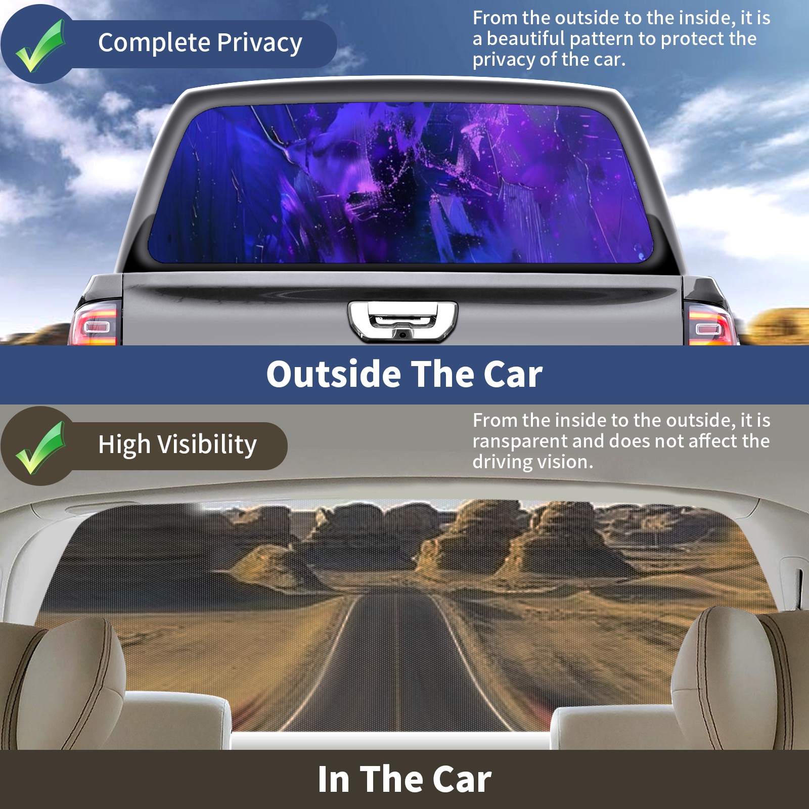 • </b>Window film one-way light transmission Protect your privacy while allowing you to enjoy the scenery outside your window!</b> <br> </b>●Decals Instructions Usage--Teach You To Use Quickly</b> <br> 1.Clean the window galss thoroughly <br> 2.Use a Squeegee or other card to scrape off the remaining water and bumps(don't use too much force) <br> 3.Remove the film's back cover .Use a knife to cut out a suitable contour and wipe off the remaining water(you can also use a hair dryer to blow dry) <br> 4.Find a suitable location and stick a sticker <br> </b>●Unique Design</b> <br> ZXIVGOQFR Back window stickers ‘s smart looking and unique cute design makes your vehicle special under sunshine. Makes your car easy to identify, perfect for finding your car in crowded parking lots and garages.funny visor reflects personality and attitude. <br> </b>●Perfect Gift for all Drivers<br></b> We create all the gifts and accessories you only need to choose what you like. Get full tailgate wraps, rear window decals, and everything you need to make your pickup truck look awesome. <br> </b> Decorate Your Pickup Truck With Rear Window Decal Today!</b>
