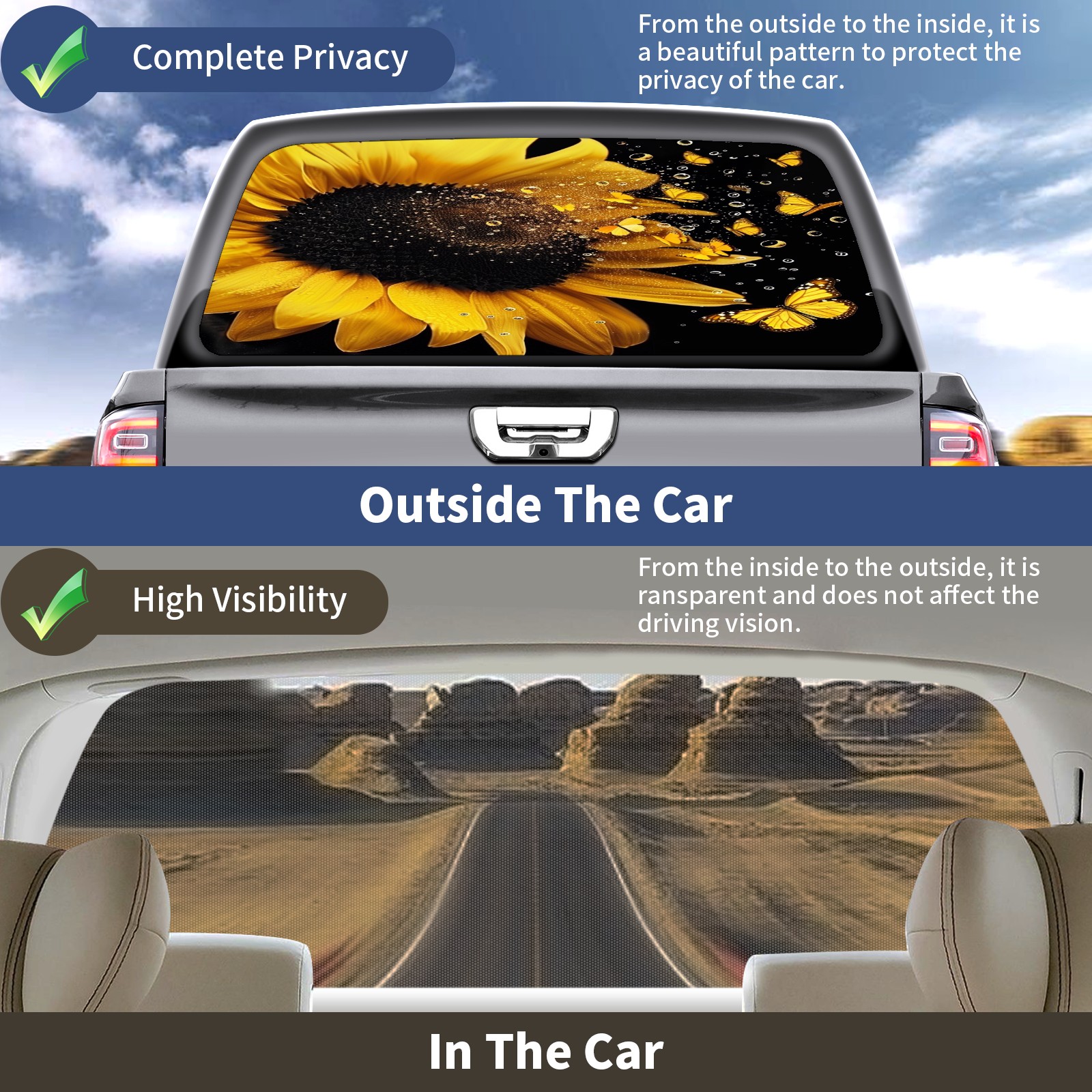 • </b>Window film one-way light transmission Protect your privacy while allowing you to enjoy the scenery outside your window!</b> <br> </b>●Decals Instructions Usage--Teach You To Use Quickly</b> <br> 1.Clean the window galss thoroughly <br> 2.Use a Squeegee or other card to scrape off the remaining water and bumps(don't use too much force) <br> 3.Remove the film's back cover .Use a knife to cut out a suitable contour and wipe off the remaining water(you can also use a hair dryer to blow dry) <br> 4.Find a suitable location and stick a sticker <br> </b>●Unique Design</b> <br> ZXIVGOQFR Back window stickers ‘s smart looking and unique cute design makes your vehicle special under sunshine. Makes your car easy to identify, perfect for finding your car in crowded parking lots and garages.funny visor reflects personality and attitude. <br> </b>●Perfect Gift for all Drivers<br></b> We create all the gifts and accessories you only need to choose what you like. Get full tailgate wraps, rear window decals, and everything you need to make your pickup truck look awesome. <br> </b> Decorate Your Pickup Truck With Rear Window Decal Today!</b>