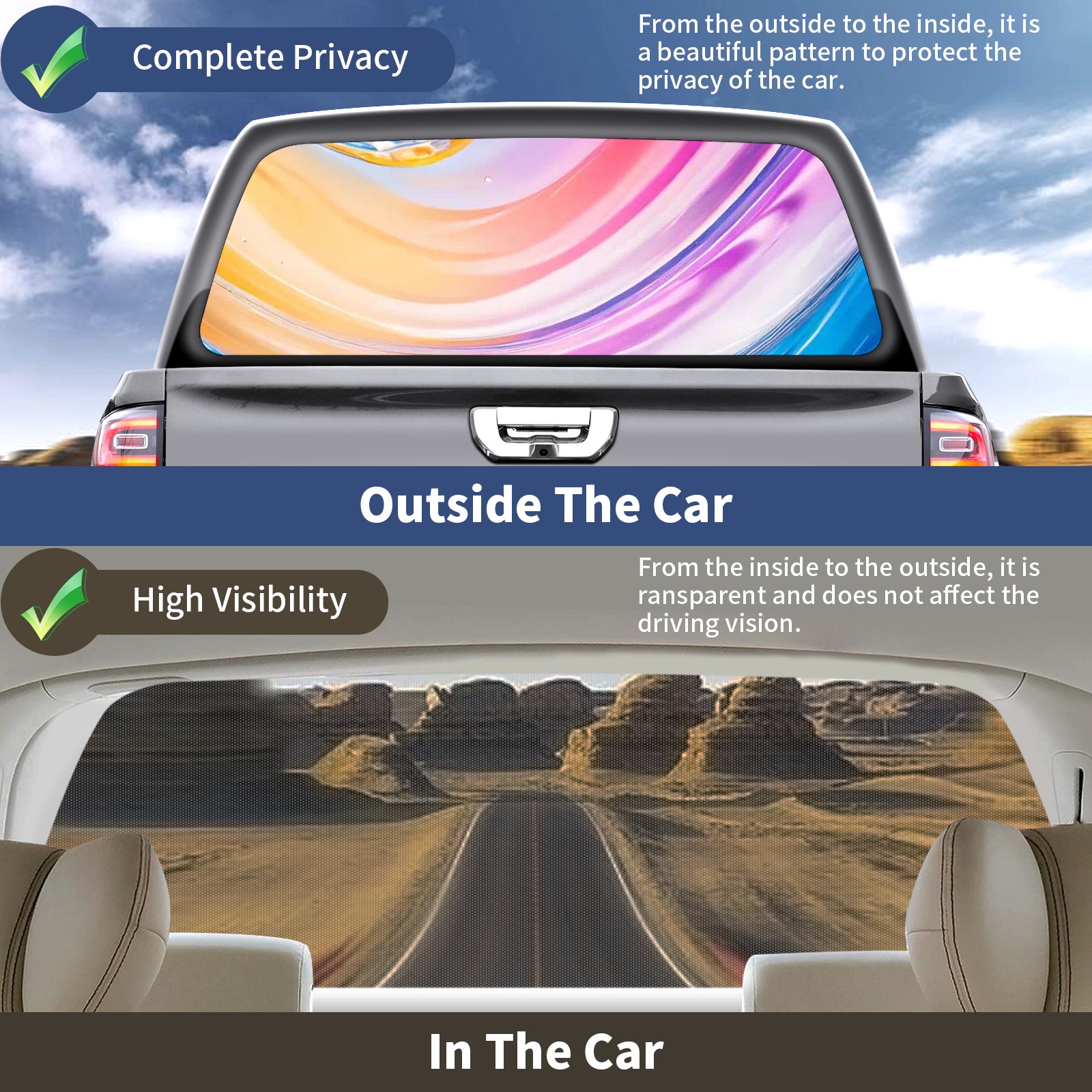• </b>Window film one-way light transmission Protect your privacy while allowing you to enjoy the scenery outside your window!</b> <br> </b>●Decals Instructions Usage--Teach You To Use Quickly</b> <br> 1.Clean the window galss thoroughly <br> 2.Use a Squeegee or other card to scrape off the remaining water and bumps(don't use too much force) <br> 3.Remove the film's back cover .Use a knife to cut out a suitable contour and wipe off the remaining water(you can also use a hair dryer to blow dry) <br> 4.Find a suitable location and stick a sticker <br> </b>●Unique Design</b> <br> ZXIVGOQFR Back window stickers ‘s smart looking and unique cute design makes your vehicle special under sunshine. Makes your car easy to identify, perfect for finding your car in crowded parking lots and garages.funny visor reflects personality and attitude. <br> </b>●Perfect Gift for all Drivers<br></b> We create all the gifts and accessories you only need to choose what you like. Get full tailgate wraps, rear window decals, and everything you need to make your pickup truck look awesome. <br> </b> Decorate Your Pickup Truck With Rear Window Decal Today!</b>