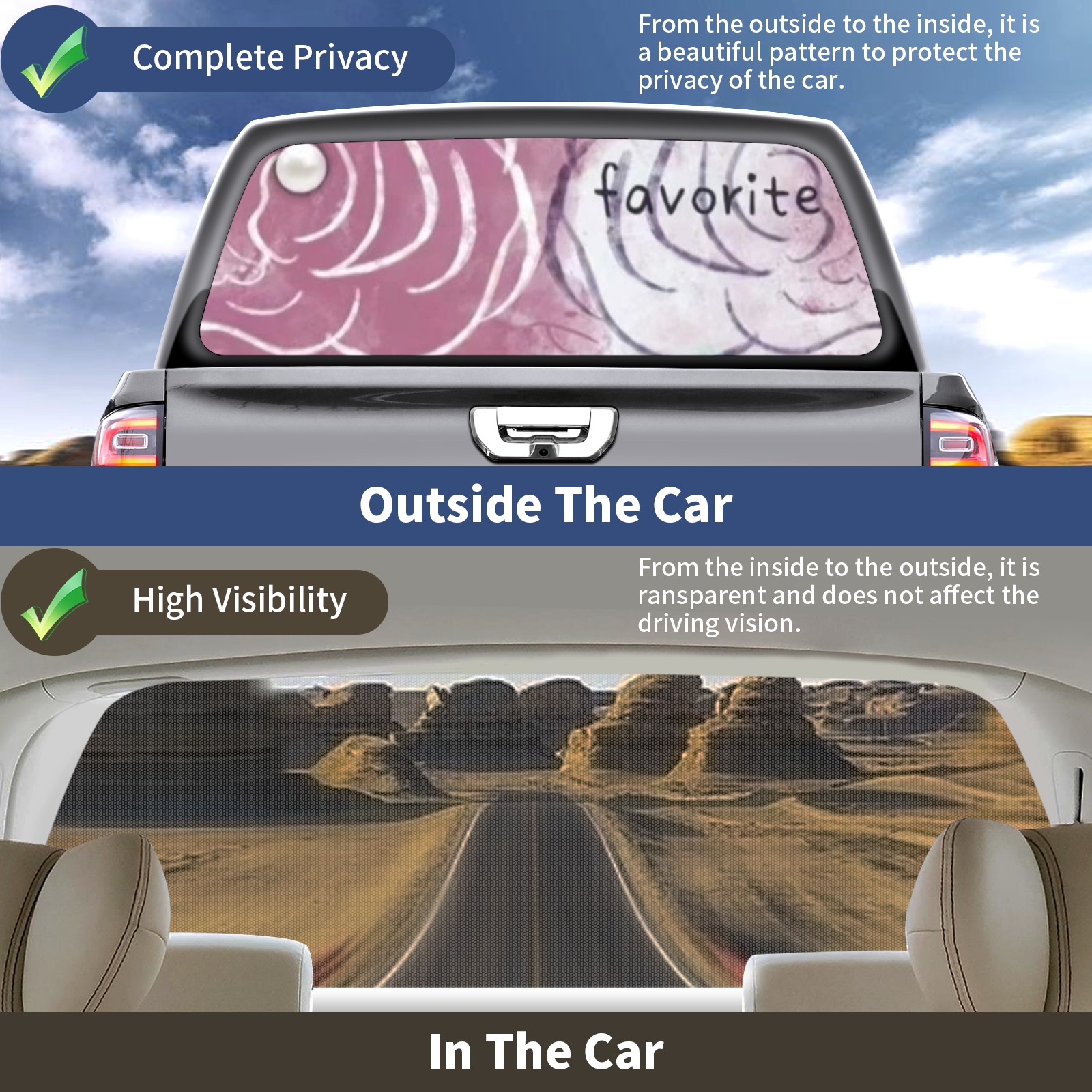 • </b>Window film one-way light transmission Protect your privacy while allowing you to enjoy the scenery outside your window!</b> <br> </b>●Decals Instructions Usage--Teach You To Use Quickly</b> <br> 1.Clean the window galss thoroughly <br> 2.Use a Squeegee or other card to scrape off the remaining water and bumps(don't use too much force) <br> 3.Remove the film's back cover .Use a knife to cut out a suitable contour and wipe off the remaining water(you can also use a hair dryer to blow dry) <br> 4.Find a suitable location and stick a sticker <br> </b>●Unique Design</b> <br> ZXIVGOQFR Back window stickers ‘s smart looking and unique cute design makes your vehicle special under sunshine. Makes your car easy to identify, perfect for finding your car in crowded parking lots and garages.funny visor reflects personality and attitude. <br> </b>●Perfect Gift for all Drivers<br></b> We create all the gifts and accessories you only need to choose what you like. Get full tailgate wraps, rear window decals, and everything you need to make your pickup truck look awesome. <br> </b> Decorate Your Pickup Truck With Rear Window Decal Today!</b>