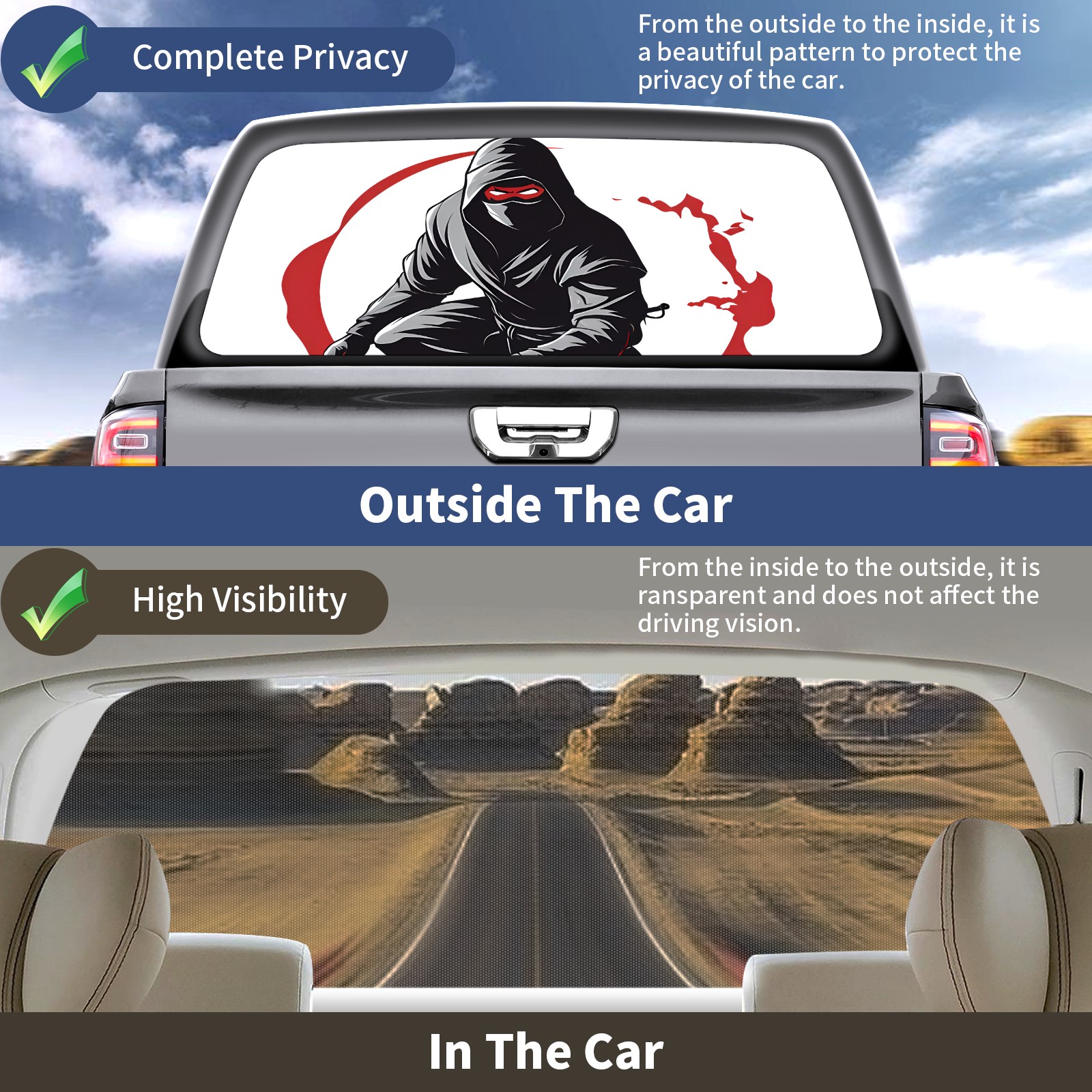 • </b>Window film one-way light transmission Protect your privacy while allowing you to enjoy the scenery outside your window!</b> <br> </b>●Decals Instructions Usage--Teach You To Use Quickly</b> <br> 1.Clean the window galss thoroughly <br> 2.Use a Squeegee or other card to scrape off the remaining water and bumps(don't use too much force) <br> 3.Remove the film's back cover .Use a knife to cut out a suitable contour and wipe off the remaining water(you can also use a hair dryer to blow dry) <br> 4.Find a suitable location and stick a sticker <br> </b>●Unique Design</b> <br> ZXIVGOQFR Back window stickers ‘s smart looking and unique cute design makes your vehicle special under sunshine. Makes your car easy to identify, perfect for finding your car in crowded parking lots and garages.funny visor reflects personality and attitude. <br> </b>●Perfect Gift for all Drivers<br></b> We create all the gifts and accessories you only need to choose what you like. Get full tailgate wraps, rear window decals, and everything you need to make your pickup truck look awesome. <br> </b> Decorate Your Pickup Truck With Rear Window Decal Today!</b>