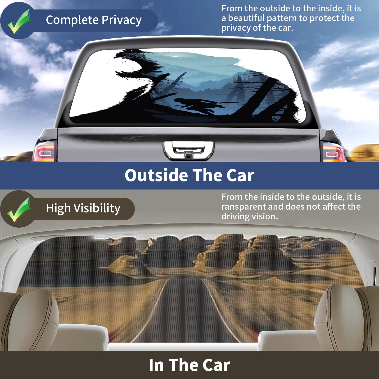 • </b>Window film one-way light transmission Protect your privacy while allowing you to enjoy the scenery outside your window!</b> <br> </b>●Decals Instructions Usage--Teach You To Use Quickly</b> <br> 1.Clean the window galss thoroughly <br> 2.Use a Squeegee or other card to scrape off the remaining water and bumps(don't use too much force) <br> 3.Remove the film's back cover .Use a knife to cut out a suitable contour and wipe off the remaining water(you can also use a hair dryer to blow dry) <br> 4.Find a suitable location and stick a sticker <br> </b>●Unique Design</b> <br> ZXIVGOQFR Back window stickers ‘s smart looking and unique cute design makes your vehicle special under sunshine. Makes your car easy to identify, perfect for finding your car in crowded parking lots and garages.funny visor reflects personality and attitude. <br> </b>●Perfect Gift for all Drivers<br></b> We create all the gifts and accessories you only need to choose what you like. Get full tailgate wraps, rear window decals, and everything you need to make your pickup truck look awesome. <br> </b> Decorate Your Pickup Truck With Rear Window Decal Today!</b>