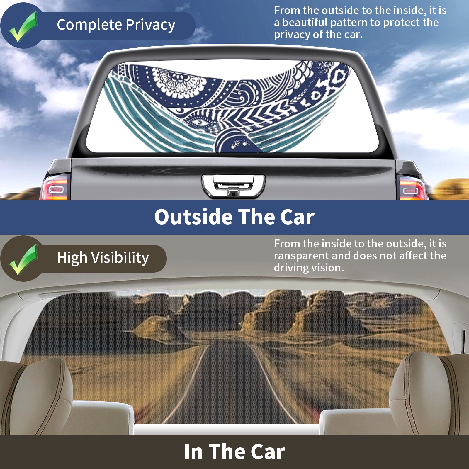 • </b>Window film one-way light transmission Protect your privacy while allowing you to enjoy the scenery outside your window!</b> <br> </b>●Decals Instructions Usage--Teach You To Use Quickly</b> <br> 1.Clean the window galss thoroughly <br> 2.Use a Squeegee or other card to scrape off the remaining water and bumps(don't use too much force) <br> 3.Remove the film's back cover .Use a knife to cut out a suitable contour and wipe off the remaining water(you can also use a hair dryer to blow dry) <br> 4.Find a suitable location and stick a sticker <br> </b>●Unique Design</b> <br> ZXIVGOQFR Back window stickers ‘s smart looking and unique cute design makes your vehicle special under sunshine. Makes your car easy to identify, perfect for finding your car in crowded parking lots and garages.funny visor reflects personality and attitude. <br> </b>●Perfect Gift for all Drivers<br></b> We create all the gifts and accessories you only need to choose what you like. Get full tailgate wraps, rear window decals, and everything you need to make your pickup truck look awesome. <br> </b> Decorate Your Pickup Truck With Rear Window Decal Today!</b>