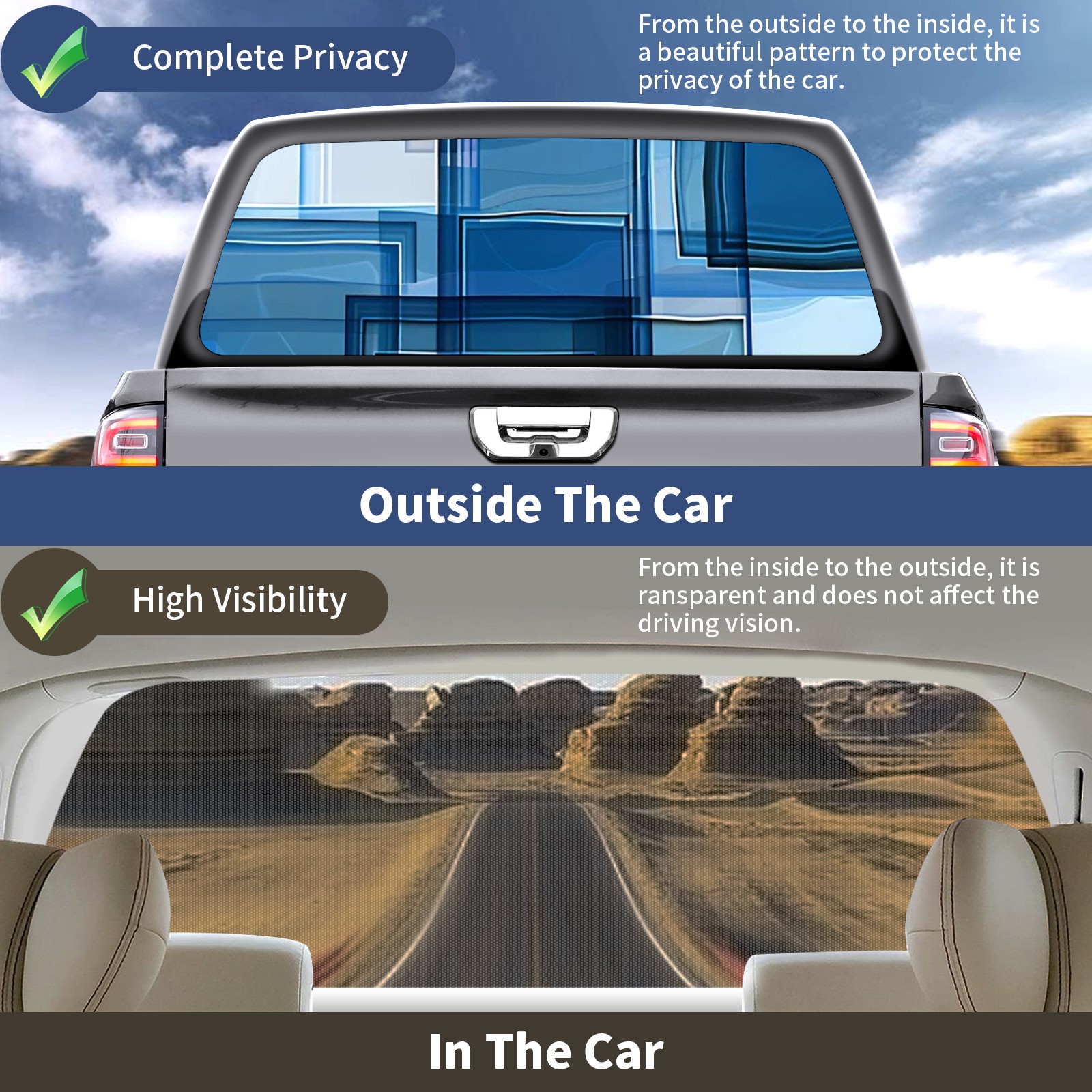 • </b>Window film one-way light transmission Protect your privacy while allowing you to enjoy the scenery outside your window!</b> <br> </b>●Decals Instructions Usage--Teach You To Use Quickly</b> <br> 1.Clean the window galss thoroughly <br> 2.Use a Squeegee or other card to scrape off the remaining water and bumps(don't use too much force) <br> 3.Remove the film's back cover .Use a knife to cut out a suitable contour and wipe off the remaining water(you can also use a hair dryer to blow dry) <br> 4.Find a suitable location and stick a sticker <br> </b>●Unique Design</b> <br> ZXIVGOQFR Back window stickers ‘s smart looking and unique cute design makes your vehicle special under sunshine. Makes your car easy to identify, perfect for finding your car in crowded parking lots and garages.funny visor reflects personality and attitude. <br> </b>●Perfect Gift for all Drivers<br></b> We create all the gifts and accessories you only need to choose what you like. Get full tailgate wraps, rear window decals, and everything you need to make your pickup truck look awesome. <br> </b> Decorate Your Pickup Truck With Rear Window Decal Today!</b>