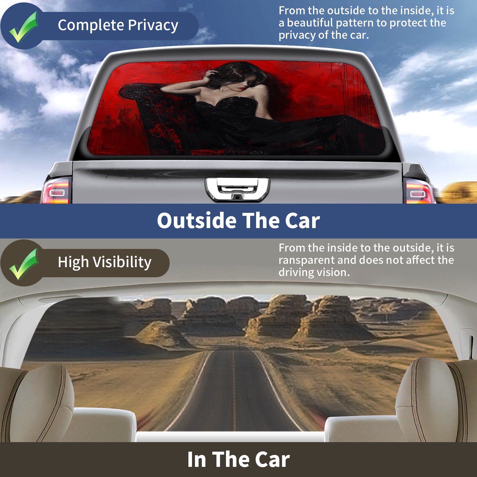 • </b>Window film one-way light transmission Protect your privacy while allowing you to enjoy the scenery outside your window!</b> <br> </b>●Decals Instructions Usage--Teach You To Use Quickly</b> <br> 1.Clean the window galss thoroughly <br> 2.Use a Squeegee or other card to scrape off the remaining water and bumps(don't use too much force) <br> 3.Remove the film's back cover .Use a knife to cut out a suitable contour and wipe off the remaining water(you can also use a hair dryer to blow dry) <br> 4.Find a suitable location and stick a sticker <br> </b>●Unique Design</b> <br> ZXIVGOQFR Back window stickers ‘s smart looking and unique cute design makes your vehicle special under sunshine. Makes your car easy to identify, perfect for finding your car in crowded parking lots and garages.funny visor reflects personality and attitude. <br> </b>●Perfect Gift for all Drivers<br></b> We create all the gifts and accessories you only need to choose what you like. Get full tailgate wraps, rear window decals, and everything you need to make your pickup truck look awesome. <br> </b> Decorate Your Pickup Truck With Rear Window Decal Today!</b>