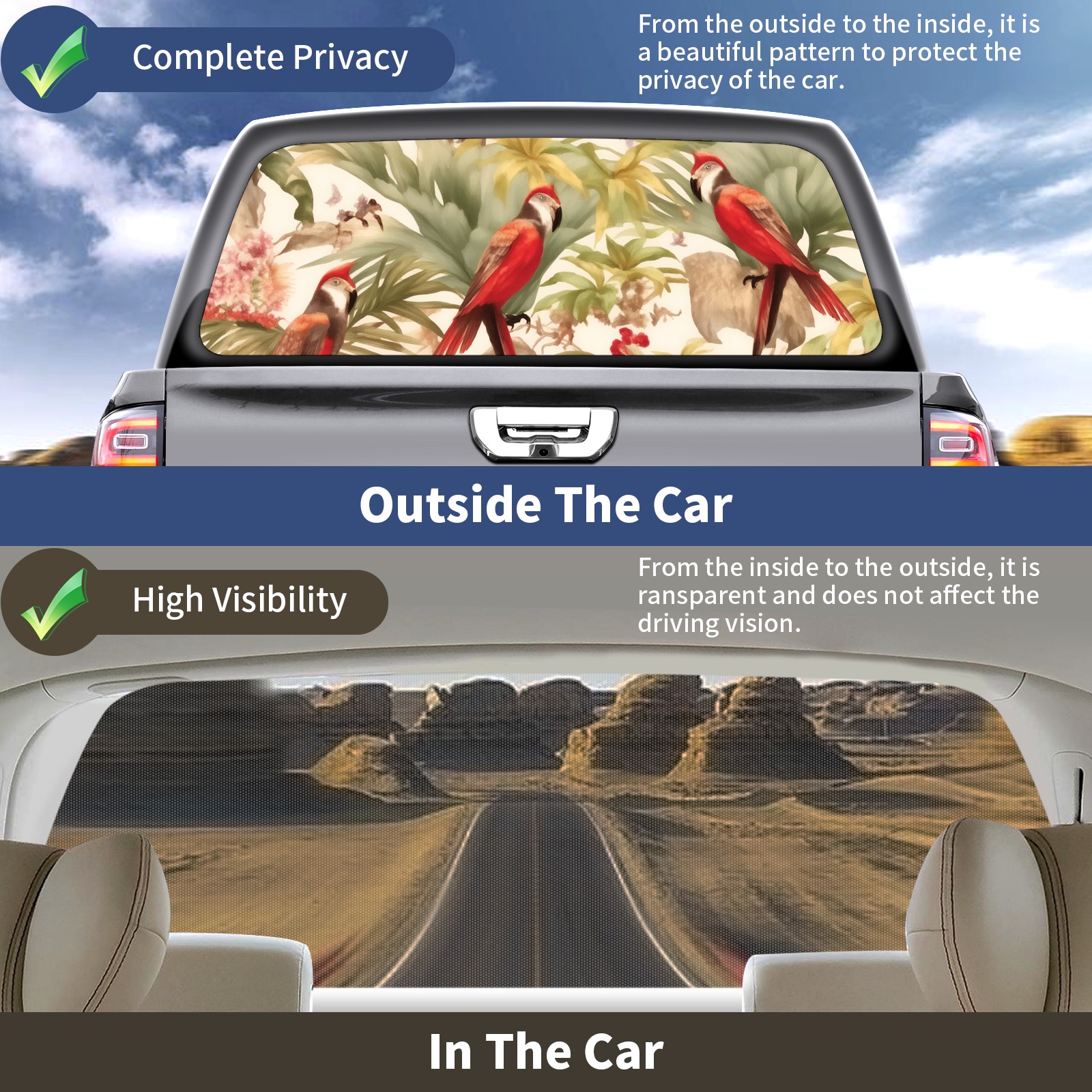 • </b>Window film one-way light transmission Protect your privacy while allowing you to enjoy the scenery outside your window!</b> <br> </b>●Decals Instructions Usage--Teach You To Use Quickly</b> <br> 1.Clean the window galss thoroughly <br> 2.Use a Squeegee or other card to scrape off the remaining water and bumps(don't use too much force) <br> 3.Remove the film's back cover .Use a knife to cut out a suitable contour and wipe off the remaining water(you can also use a hair dryer to blow dry) <br> 4.Find a suitable location and stick a sticker <br> </b>●Unique Design</b> <br> ZXIVGOQFR Back window stickers ‘s smart looking and unique cute design makes your vehicle special under sunshine. Makes your car easy to identify, perfect for finding your car in crowded parking lots and garages.funny visor reflects personality and attitude. <br> </b>●Perfect Gift for all Drivers<br></b> We create all the gifts and accessories you only need to choose what you like. Get full tailgate wraps, rear window decals, and everything you need to make your pickup truck look awesome. <br> </b> Decorate Your Pickup Truck With Rear Window Decal Today!</b>