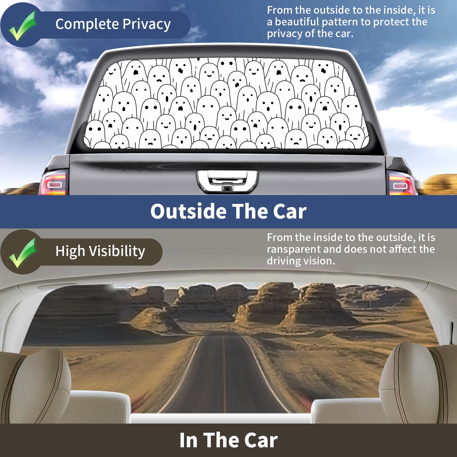 • </b>Window film one-way light transmission Protect your privacy while allowing you to enjoy the scenery outside your window!</b> <br> </b>●Decals Instructions Usage--Teach You To Use Quickly</b> <br> 1.Clean the window galss thoroughly <br> 2.Use a Squeegee or other card to scrape off the remaining water and bumps(don't use too much force) <br> 3.Remove the film's back cover .Use a knife to cut out a suitable contour and wipe off the remaining water(you can also use a hair dryer to blow dry) <br> 4.Find a suitable location and stick a sticker <br> </b>●Unique Design</b> <br> ZXIVGOQFR Back window stickers ‘s smart looking and unique cute design makes your vehicle special under sunshine. Makes your car easy to identify, perfect for finding your car in crowded parking lots and garages.funny visor reflects personality and attitude. <br> </b>●Perfect Gift for all Drivers<br></b> We create all the gifts and accessories you only need to choose what you like. Get full tailgate wraps, rear window decals, and everything you need to make your pickup truck look awesome. <br> </b> Decorate Your Pickup Truck With Rear Window Decal Today!</b>
