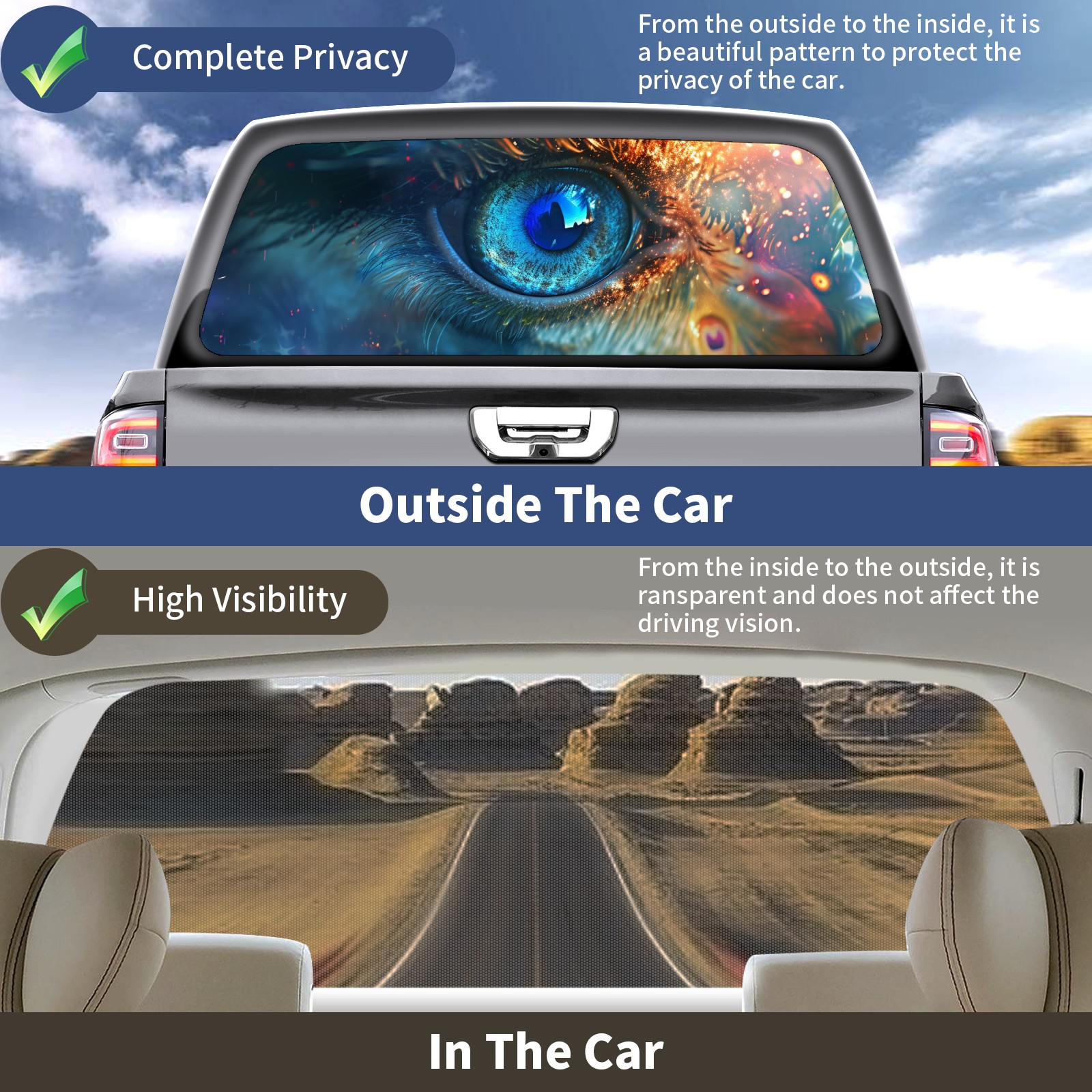 • <b>One-Way Light Transmission Window Film Protect Your Privacy While Allowing You To Enjoy The Scenery Outside Your Window!</b> <br> <b>●Decals Instructions Usage--Teach You To Use Quickly</b> <br> 1.Clean the window galss thoroughly <br> 2.Use a Squeegee or other card to scrape off the remaining water and bumps(don't use too much force) <br> 3.Remove the film's back cover .Use a knife to cut out a suitable contour and wipe off the remaining water(you can also use a hair dryer to blow dry) <br> 4.Find a suitable location and stick a sticker <br> <b>●Unique Design</b> <br> ZXIVGOQFR Back window stickers ‘s smart looking and unique cute design makes your vehicle special under sunshine. Makes your car easy to identify, perfect for finding your car in crowded parking lots and garages.funny visor reflects personality and attitude. <br> <b>●Perfect Gift for all Drivers<br></b> We create all the gifts and accessories you only need to choose what you like. Get full tailgate wraps, rear window decals, and everything you need to make your pickup truck look awesome. <br> <b>Decorate Your Pickup Truck With Rear Window Decal Today!</b>